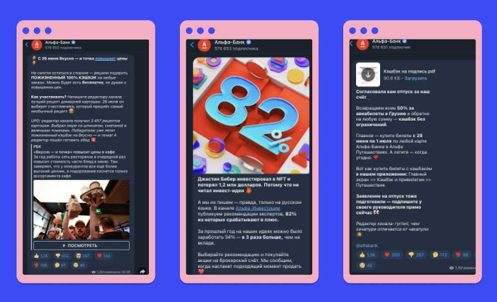 Пример: похоже, что именно этот подход к контенту лежит в основе Telegram-канала Альфа-Банка. Бренд оперативно выпускает ситуативы, освещает события, реагирует на обстановку в мире.