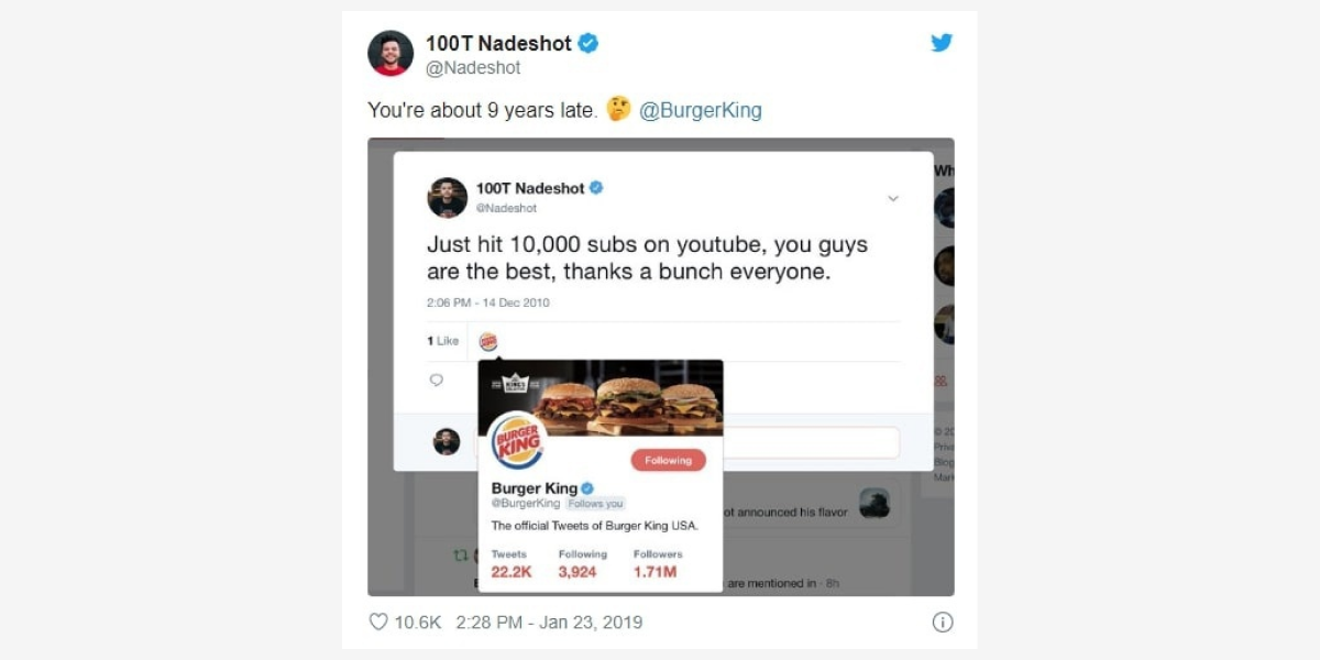 Как так вышло? Бургер Кинг стал ставить лайки инфлюенсерам, а точнее – их постам девятилетней давности. Это заметили – сначала популярный киберспортсмен Нэйдшот.