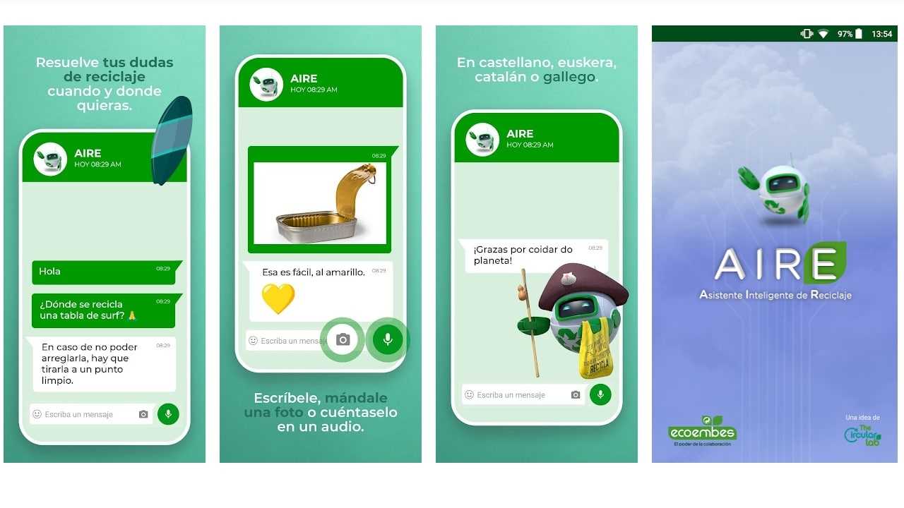 AIRE расшифровывается как Ecoembes Virtual Recycling Assistant.. Приложение типа чат-бота, созданное Ecoembes, некоммерческой организацией, занимающейся заботой об окружающей среде посредством переработки и эко-дизайна бытовой упаковки. Поэтому то, что вы можете ожидать от этого приложения, — это своего рода Siri для переработки, в которой вы можете задавать свои вопросы, и она вам ответит. Конечно, вопросы, на которые вы можете ответить, касаются темы вторичной переработки. Например, вы можете проверить цвет контейнера, куда выбрасывать отходы, если у вас есть сомнения, или, возможно, спросить, куда вы можете выбросить батарейки, лампочку, кофейные капсулы или алюминиевую фольгу. Вещи, в которых еще много сомнений.