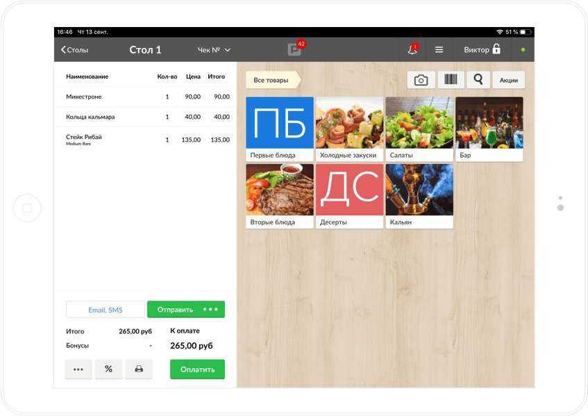 - Контроль зала. Сотрудник (официант) принимает заказ у клиента с прерогативой мгновенной отправки сообщения на кухню. Официант использует рабочий планшет под ОС ios android;