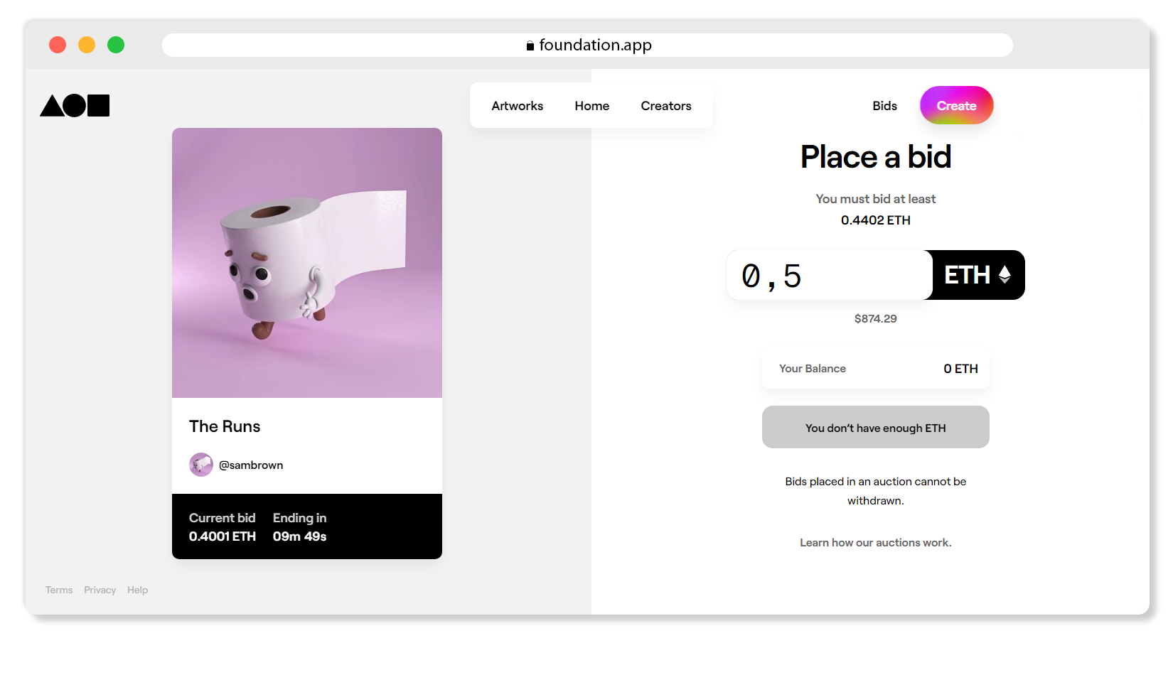 Например, цена токена «The Runs» 0,4 ETH, а время до конца аукциона — 9 минут