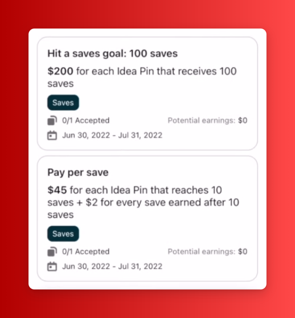 Разберем схему заработка на примере одной из Save Goal на месяц. Вы получаете $25 за пин, если его сохранили 10 человек. За каждое дополнительное сохранение вы зарабатываете $2. Но есть еще одно условие: 10 человек должны сохранить ваш пин в течение 30 дней. Если этого не произошло, цель считается невыполненной. Как сообщает одна из участниц программы, набрать десять сохранений нелегко — она опытная креатор, но даже у нее цель в 10 сохранений достигается не всегда.