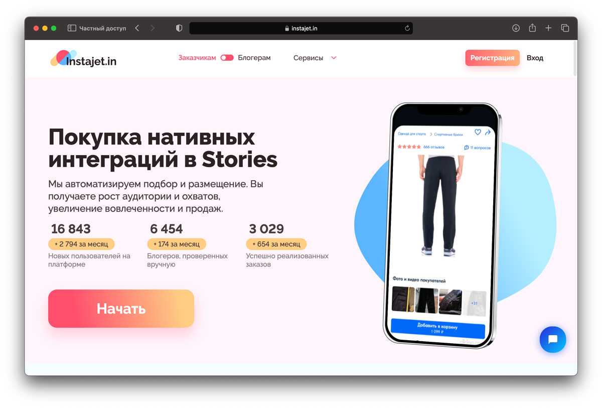 InstaJet.in — это биржа нативных интеграций, которая предоставляет платформу для предпринимателей и брендов, желающих продвигать свои товары и услуги через публикации в Stories у популярных блогеров. Сервис помогает блогерам увеличить продажи и заработать, а также предоставляет возможность брендам заказывать публикации напрямую от блогеров.