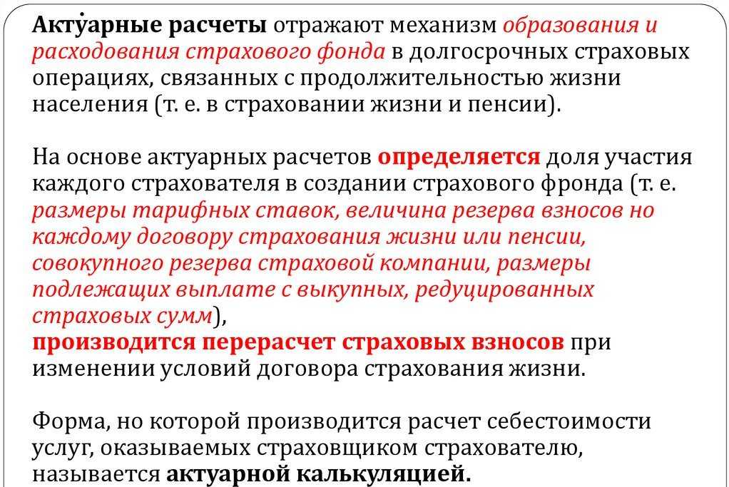 На основании актуарных расчетов определяется доля участия каждого страхователя в создании страхового фонда, производится перерасчет страховых взносов при изменении условий договора страхования жизни, определяются размеры тарифных ставок.