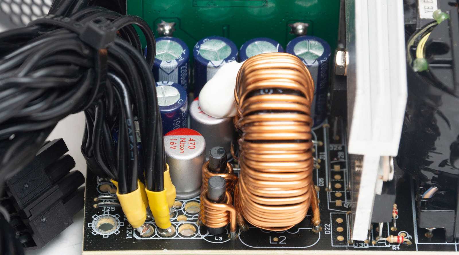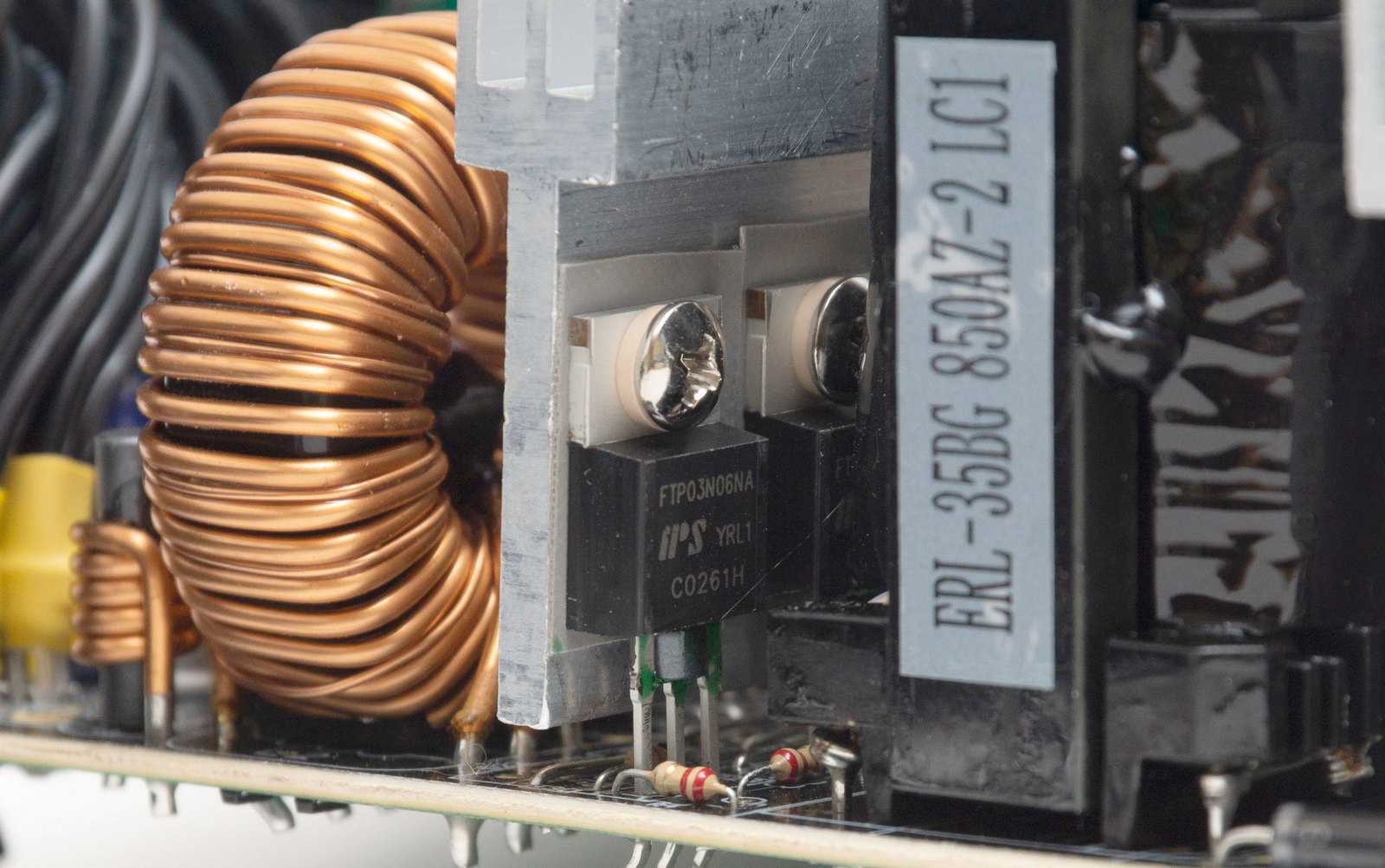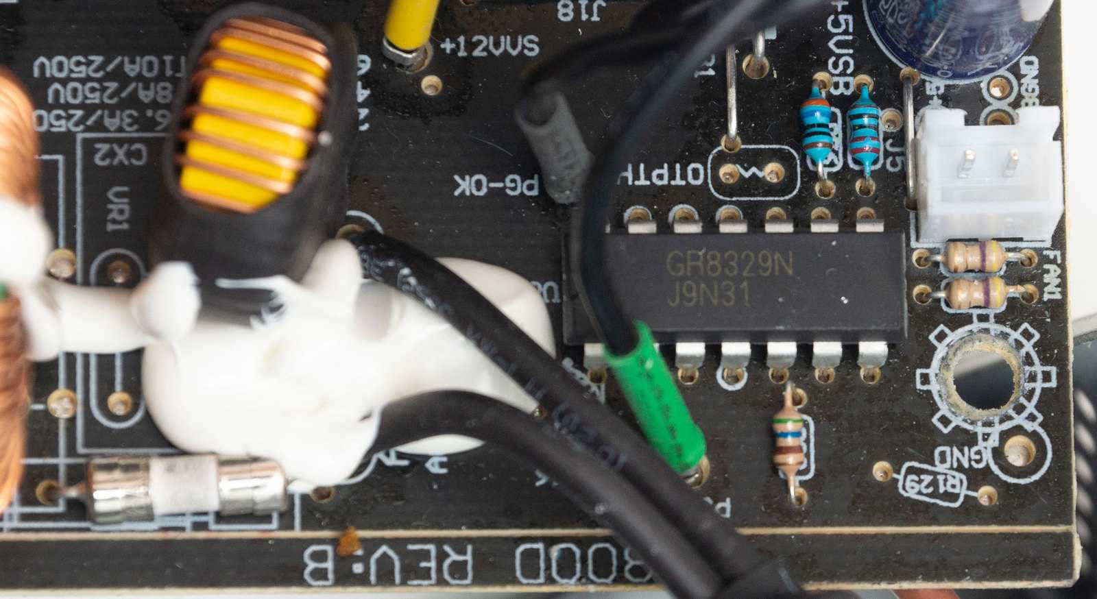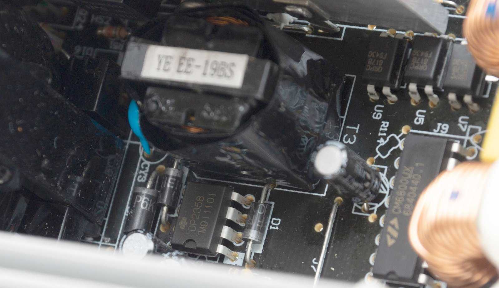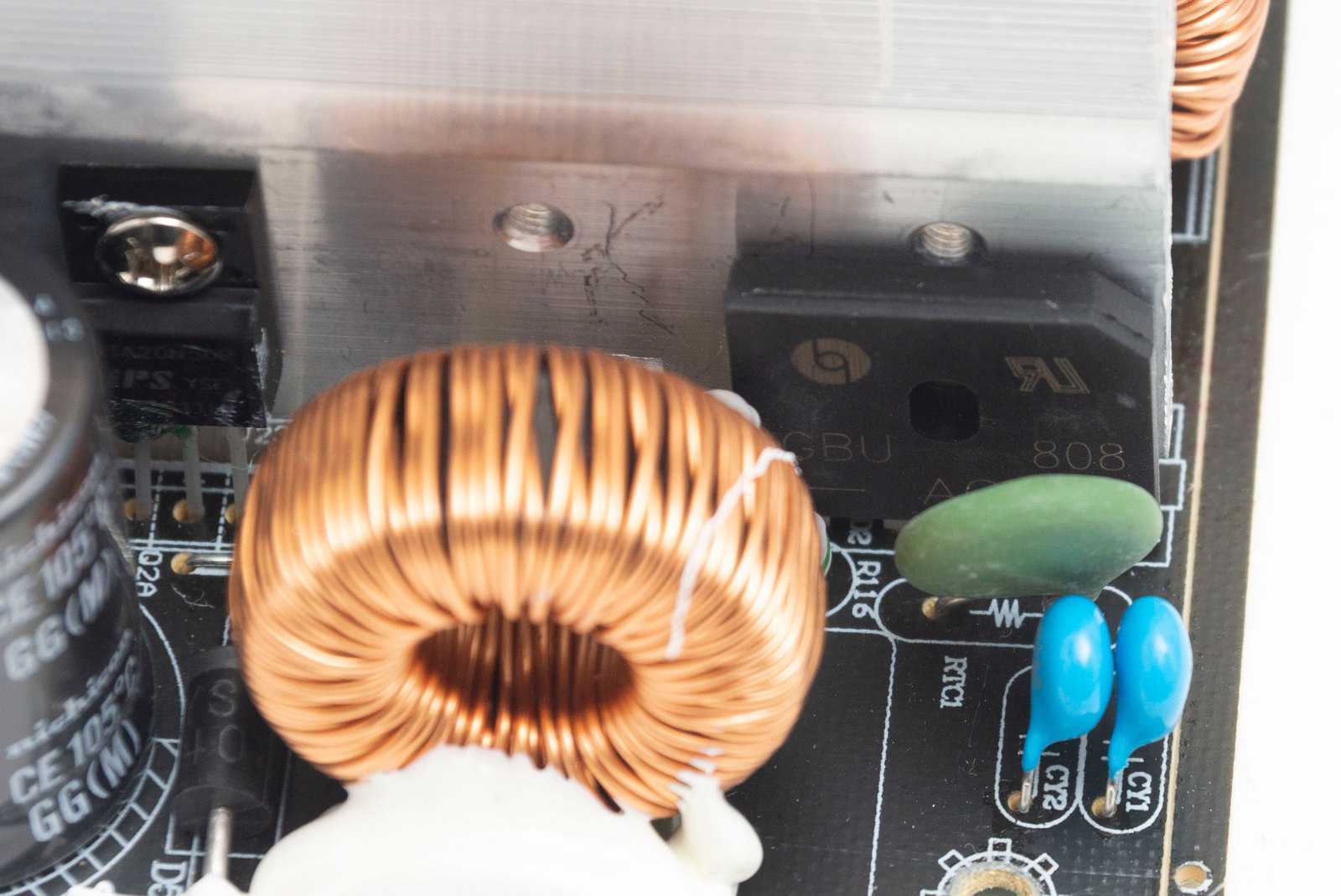 На входе мы видим EMI-фильтр, первое звено распаяно на входной розетке: два Y-конденсатора и один Х-конденсатор. Еще два Y-конденсатора, два Х-конденсатора и три дросселя распаяны на краю основной платы. Варистор отсутствует, хотя место под него на плате запланировано, имеется только плавкий предохранитель в керамическом корпусе. Дроссели намотаны проволокой мелкого сечения, что будет приводить к большему их нагреву. Этот же недостаток мы видим и на дросселе APFC.