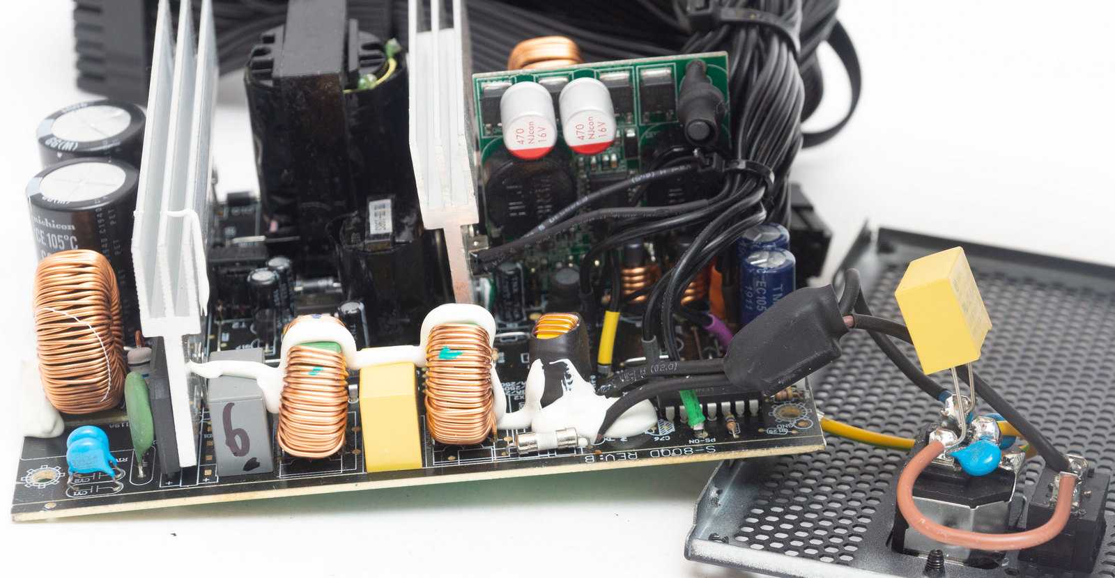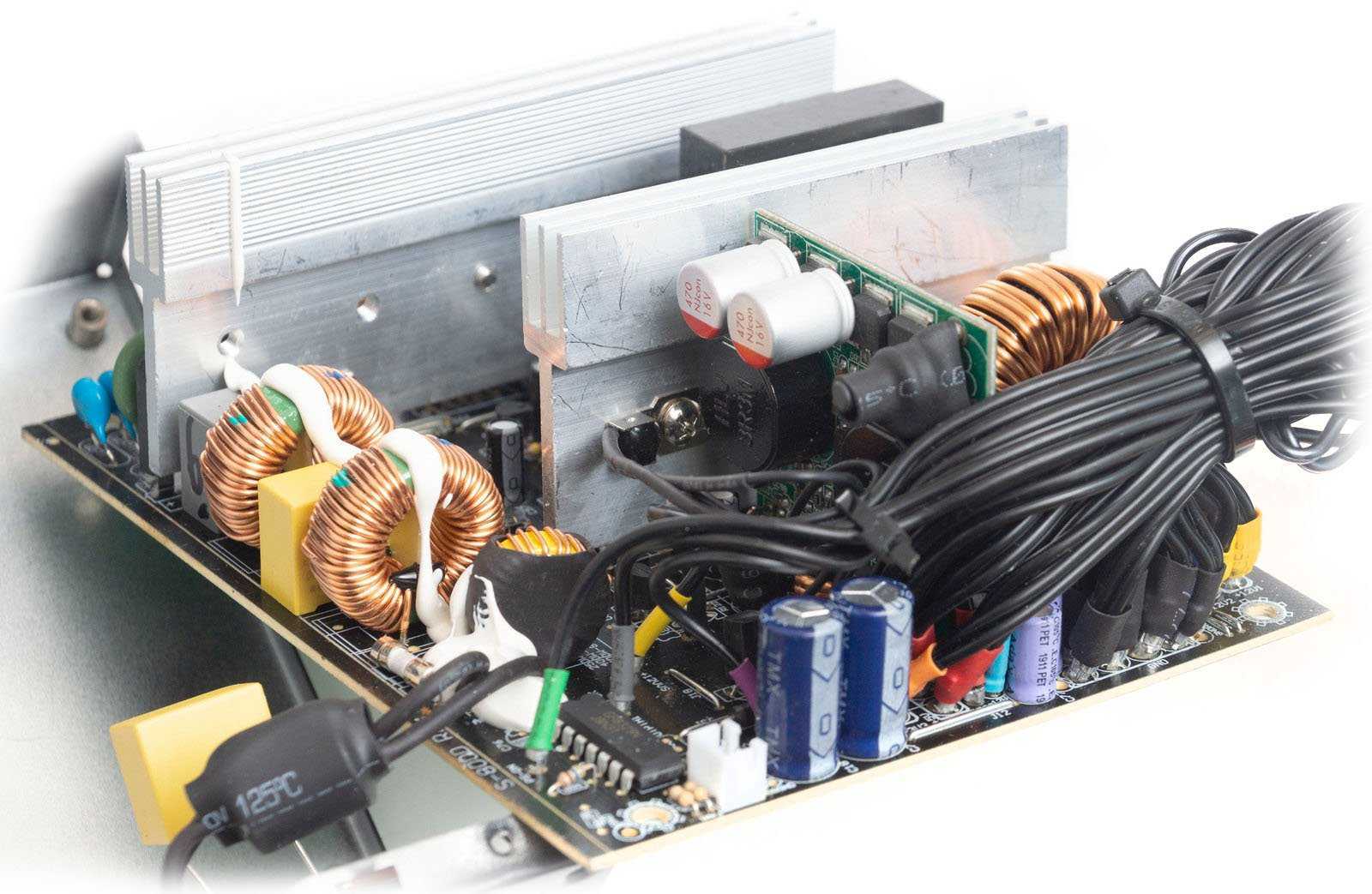 Перпендикулярно радиатору расположена вертикальная плата с DC-DC преобразователями вторичных линий.