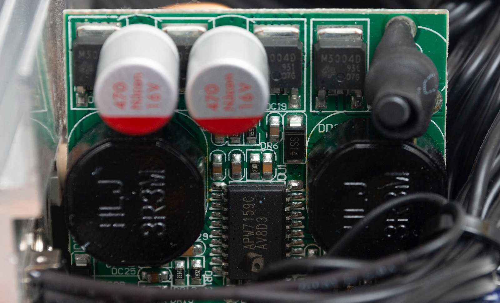 На плате — четыре транзистора M3004D, по два на каждый канал, и контроллер APW7159C.