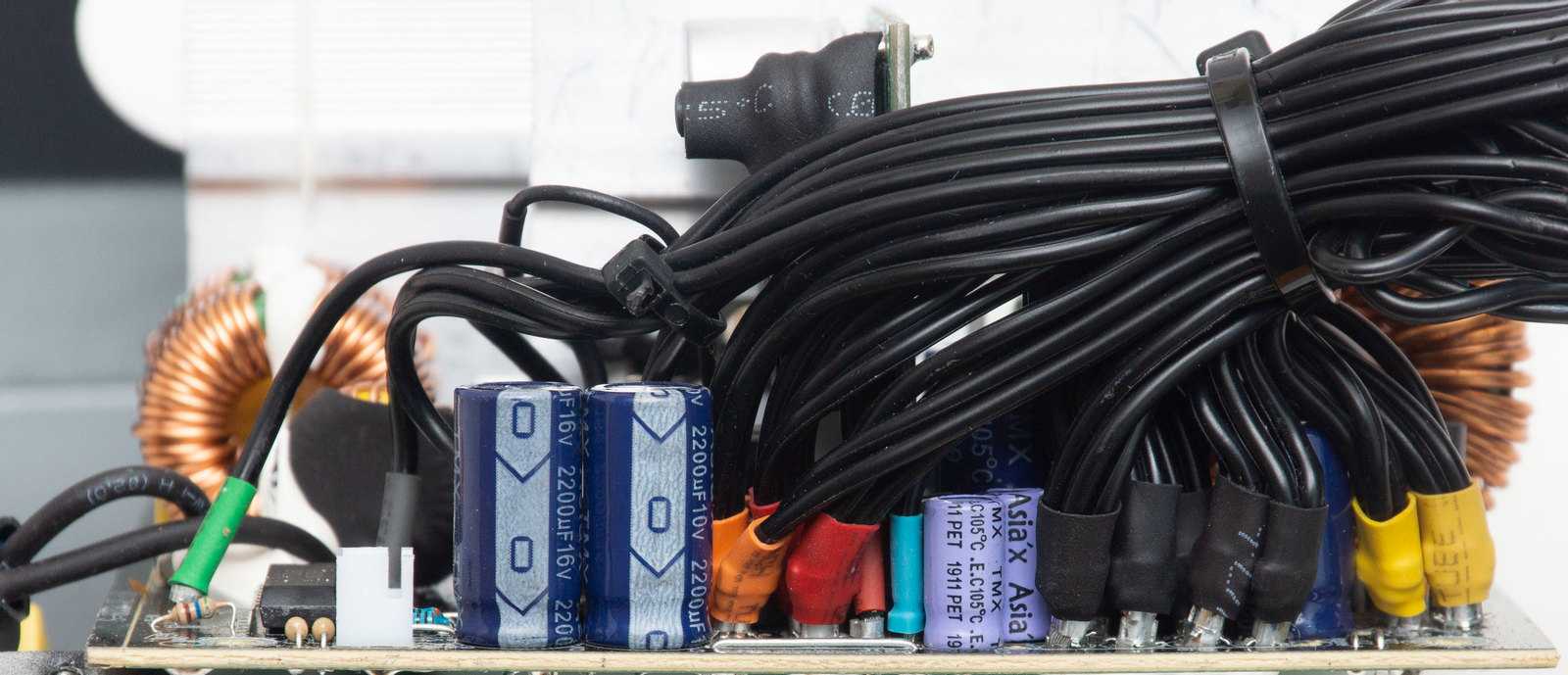 Блок питания выполнен на основе двухтактного прямоходового преобразователя и DC-DC преобразователя во вторичной цепи. Отказ от групповой стабилизации популярен в последнее время, и это хорошо сказывается на стабильности напряжений. Также мы видим еще несколько плюсов: использование мосфетов вместо диодных сборок для формирования линии +12 В и японские конденсаторы высоковольтной цепи.