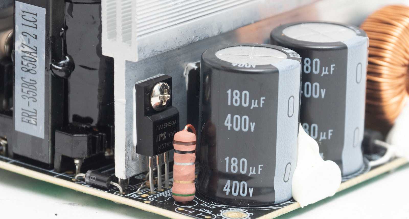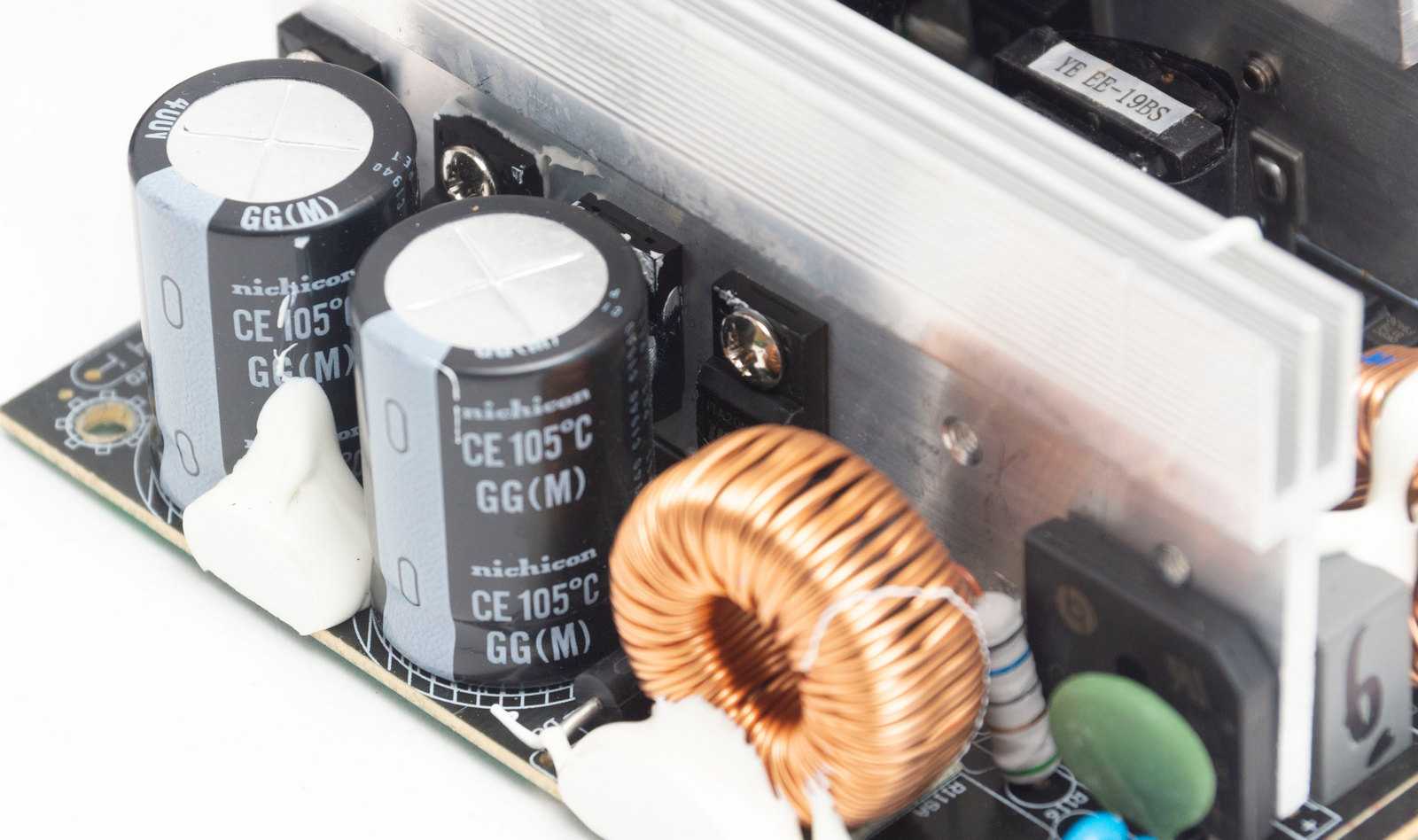 В высоковольтной цепи установлены два конденсатора среднего размера японского производства Nichicon. Емкость по 180 мкФ, рассчитаны на напряжение до 400 В и температуру до 105 °C.