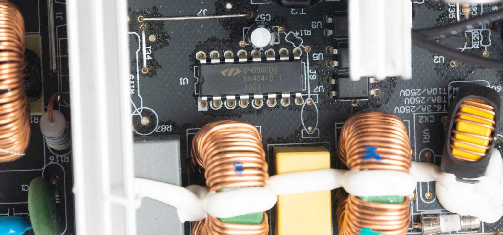 Контроллер преобразователя и корректора мощности CM6800UX разместился на плате с другой стороны от радиатора.