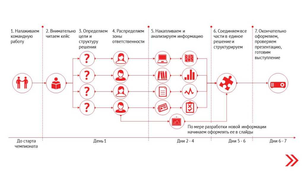 - Дни 3–4. Работайте параллельно, накапливая и поэтапно анализируя информацию. Готовые части решения лучше сразу оформлять в слайды и отсылать их члену команды, верстающему финальную презентацию.