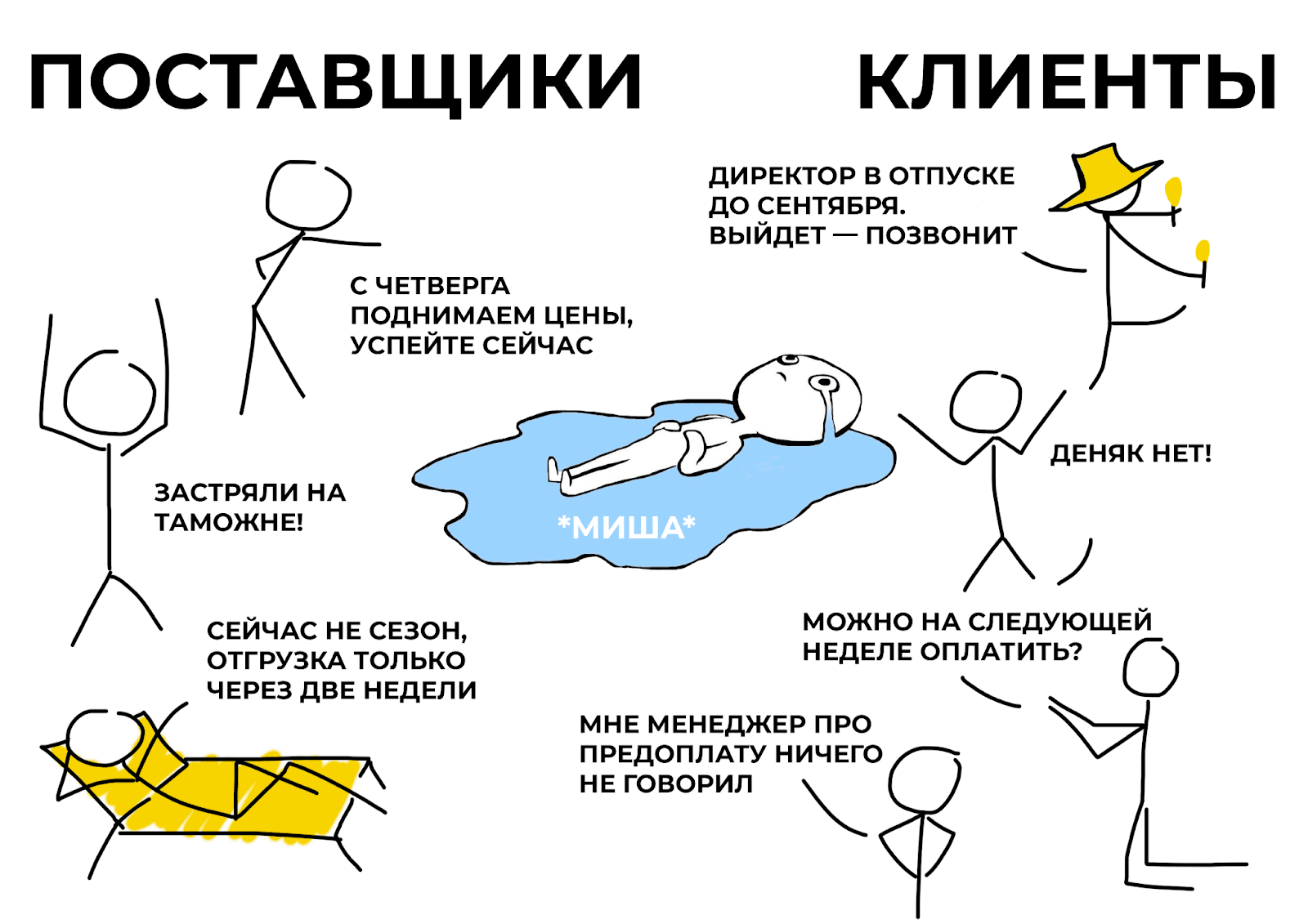 Миша делает кирпичи в Саратове, и ему срочно понадобилась известь от компании «Пески и глины». Компании заключили договор на год поставок. Миша внес половину суммы, но менеджер перестал отвечать на звонки после второй отгрузки. Потом оказалось, что «Пески и глины» — банкрот, а Миша не сможет ни вернуть предоплату, ни получить известь. Всё потому, что поставщик — ненадежный. |