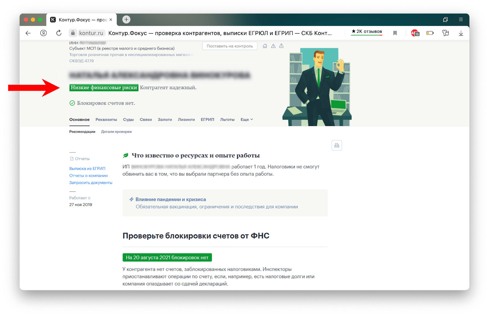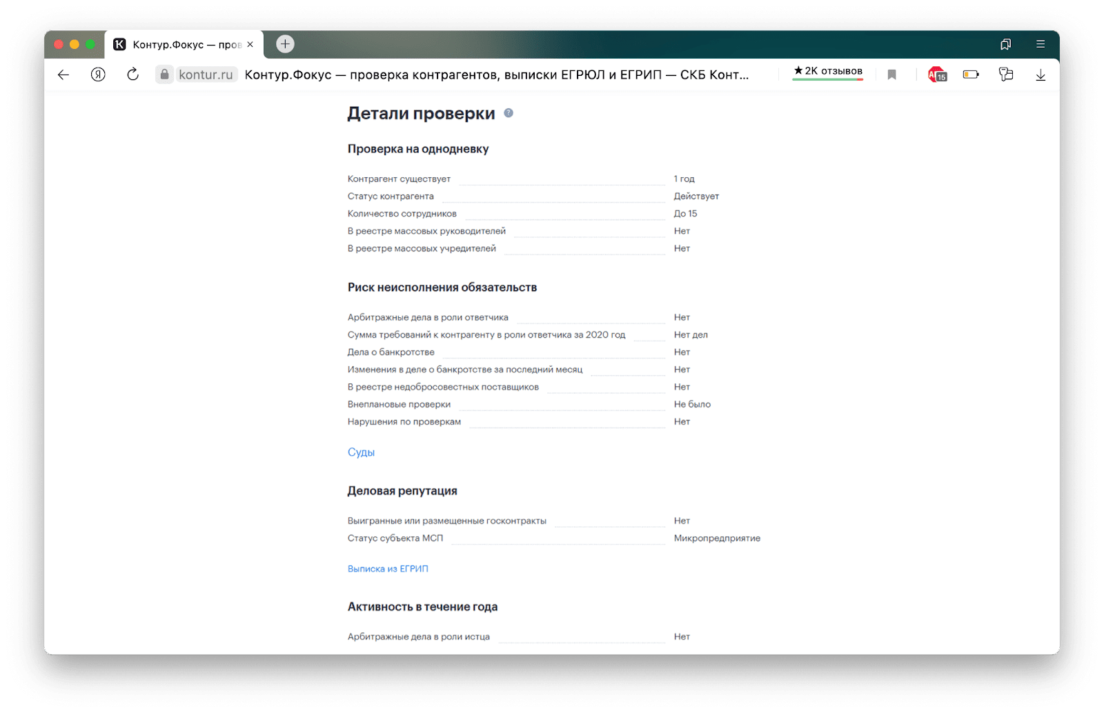 Платные сервисы собирают информацию из большего количества открытых источников. Например, «Сбис» собирает данные о компаниях и владельцах из шести источников: налоговой, службы статистики, Центробанка, Роспатента, верховного суда и казначейства. «Контур.Фокус» использует двадцать девять источников. А результаты проверки выглядят так: