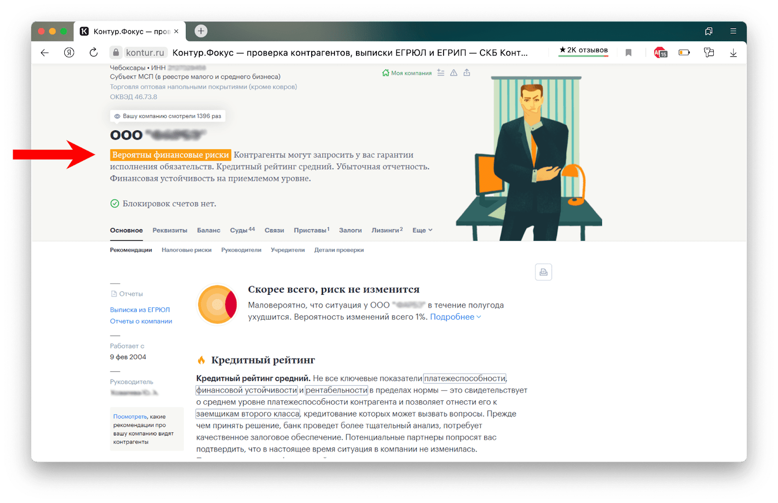 Проверка компании через Контур.Фокус: сервис говорит, что финансовый риск есть, и в ближайшие полгода лучше не станет