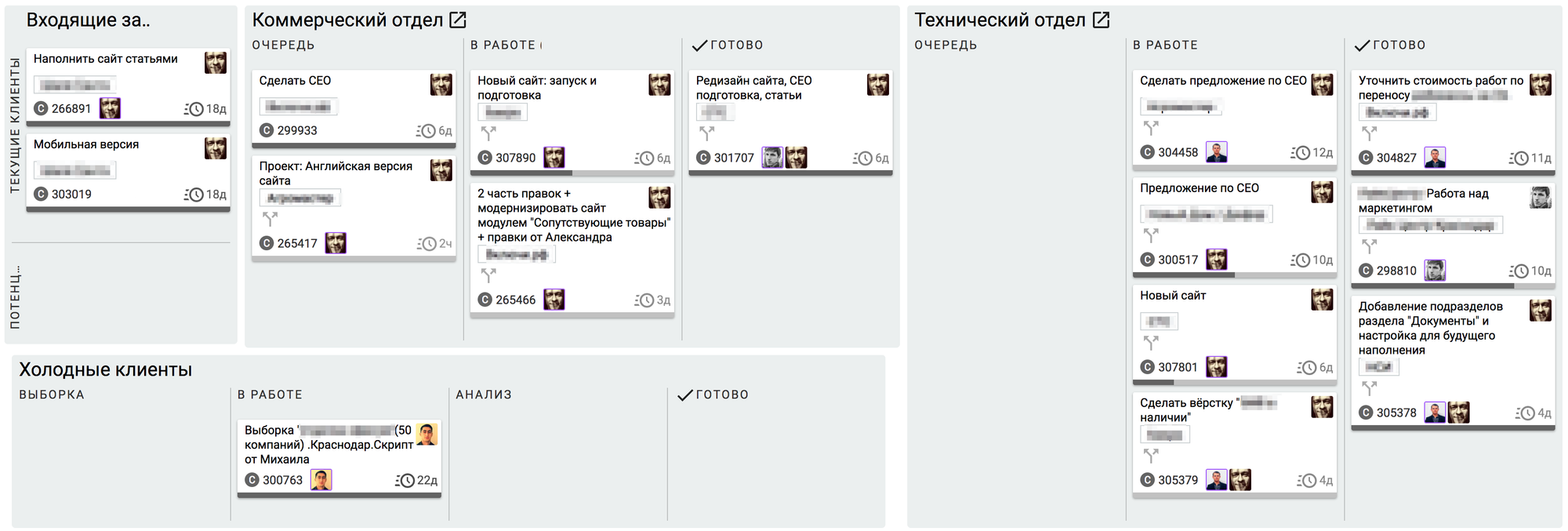«Коммерческий» и «Производственный отдел» разворачиваются в отдельные пространства, где можно увидеть детализированную ситуацию по работе с клиентами и декомпозицию задач верхнего уровня на технические подзадачи.