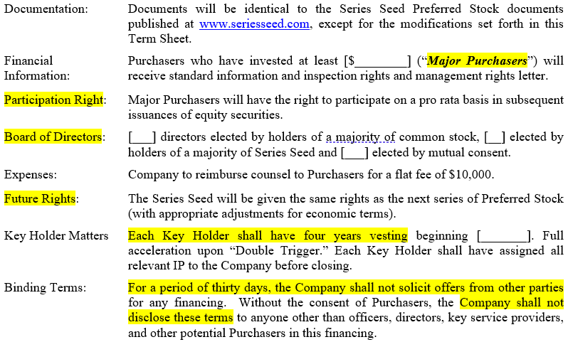 The image shown above is the second half of the Series Seed Term Sheet template. Highlighted terms are discussed below: