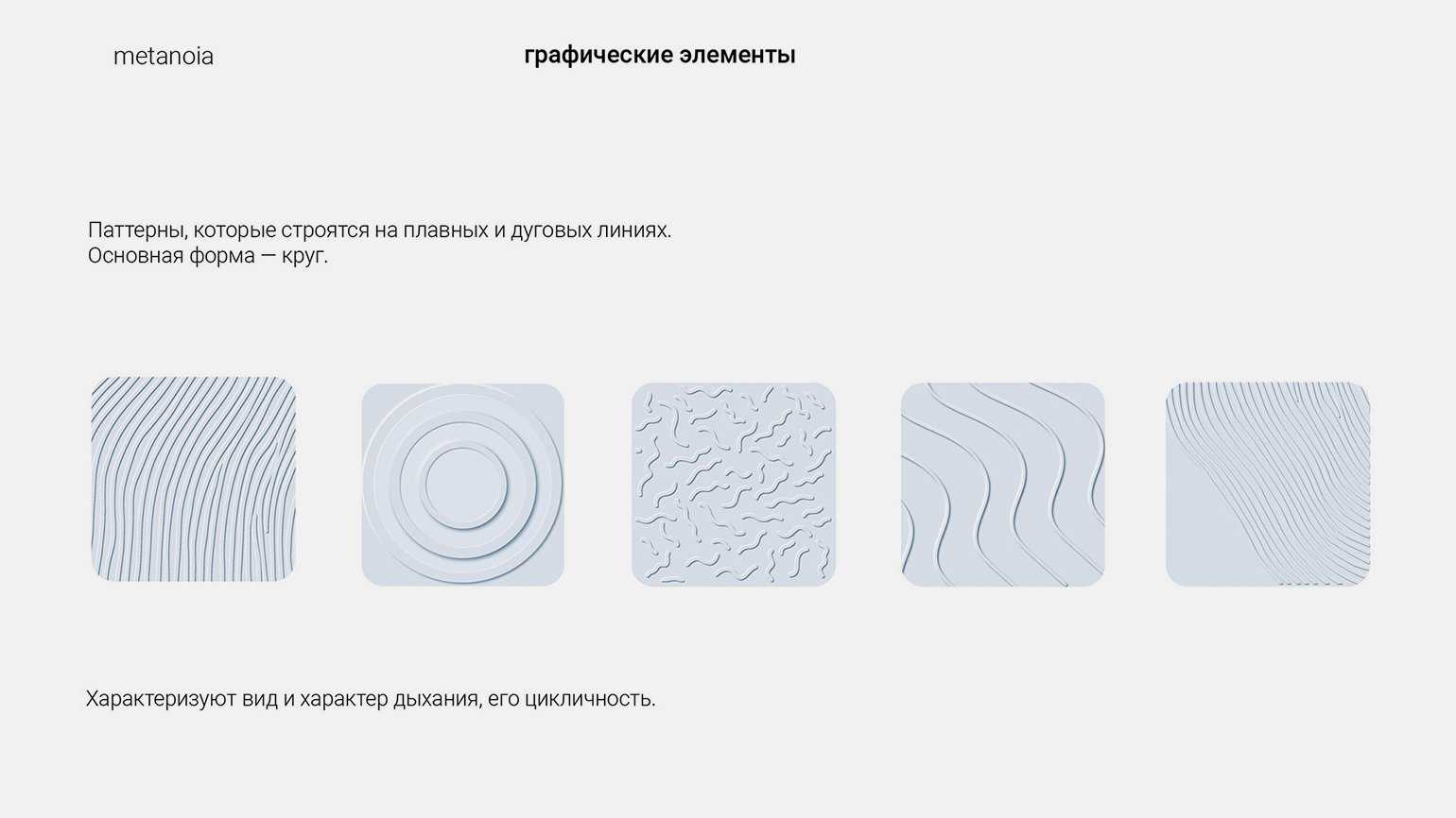 В дизайне используется несколько ключевых графических элементов: уроборос, круг, глаз как символ цикличности, совершенства и фокуса на себе. А ещё паттерн с волнистыми линиями ― тоже визуальная метафора спокойного цикличного дыхания.