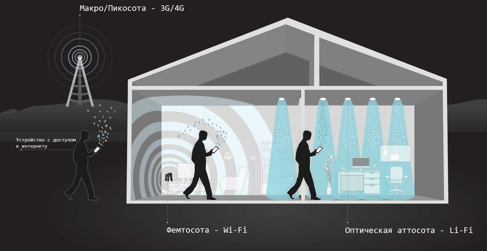 Расстояние покрытия Li-Fi составляет 10 метров, в то время как для Wi-Fi — 32 метра.