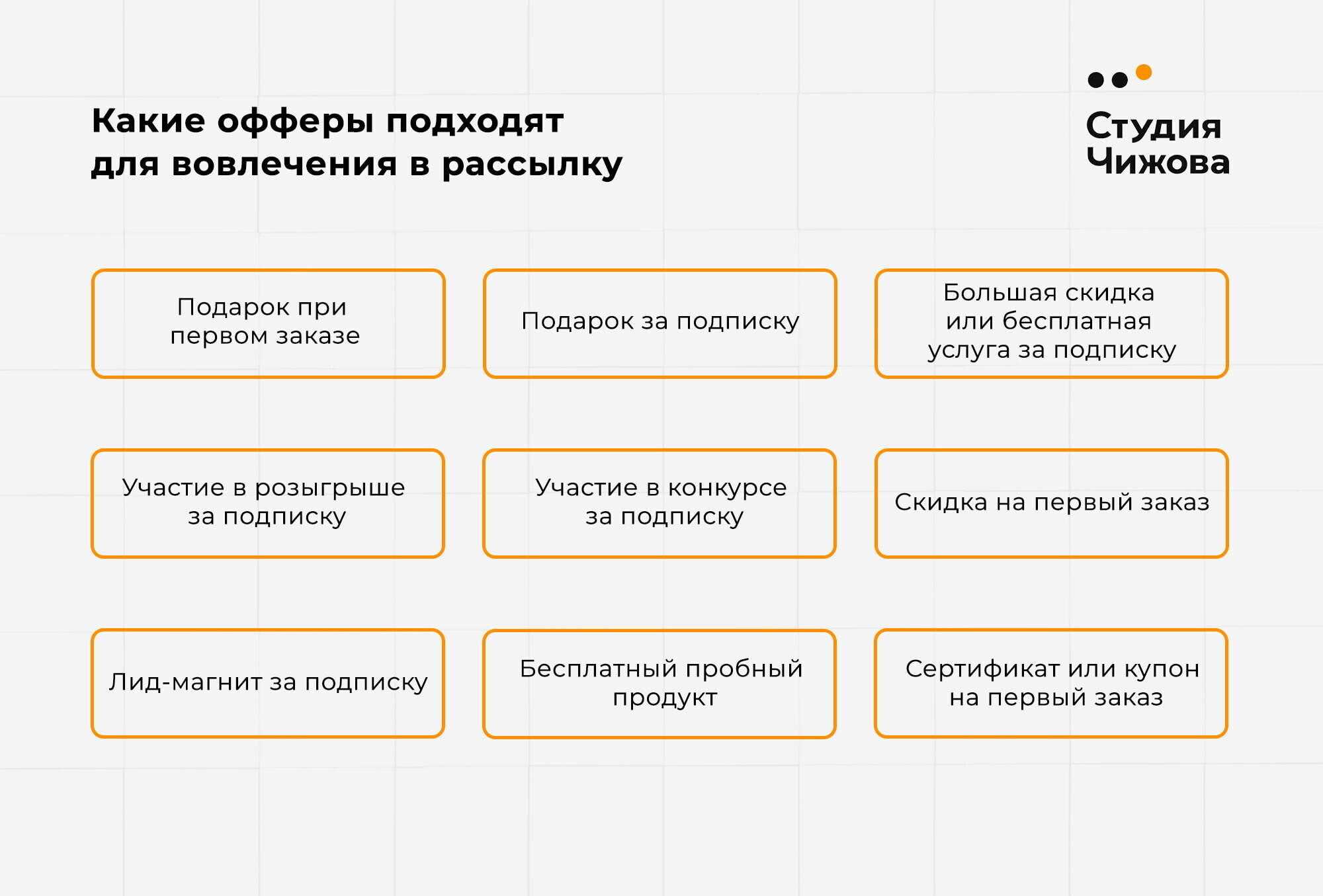 Для вовлечения пользователей в рассылку нужен сильный оффер и ценный контент. На получение спама никто не подпишется. В наших проектах показали свою эффективность несколько видов офферов.