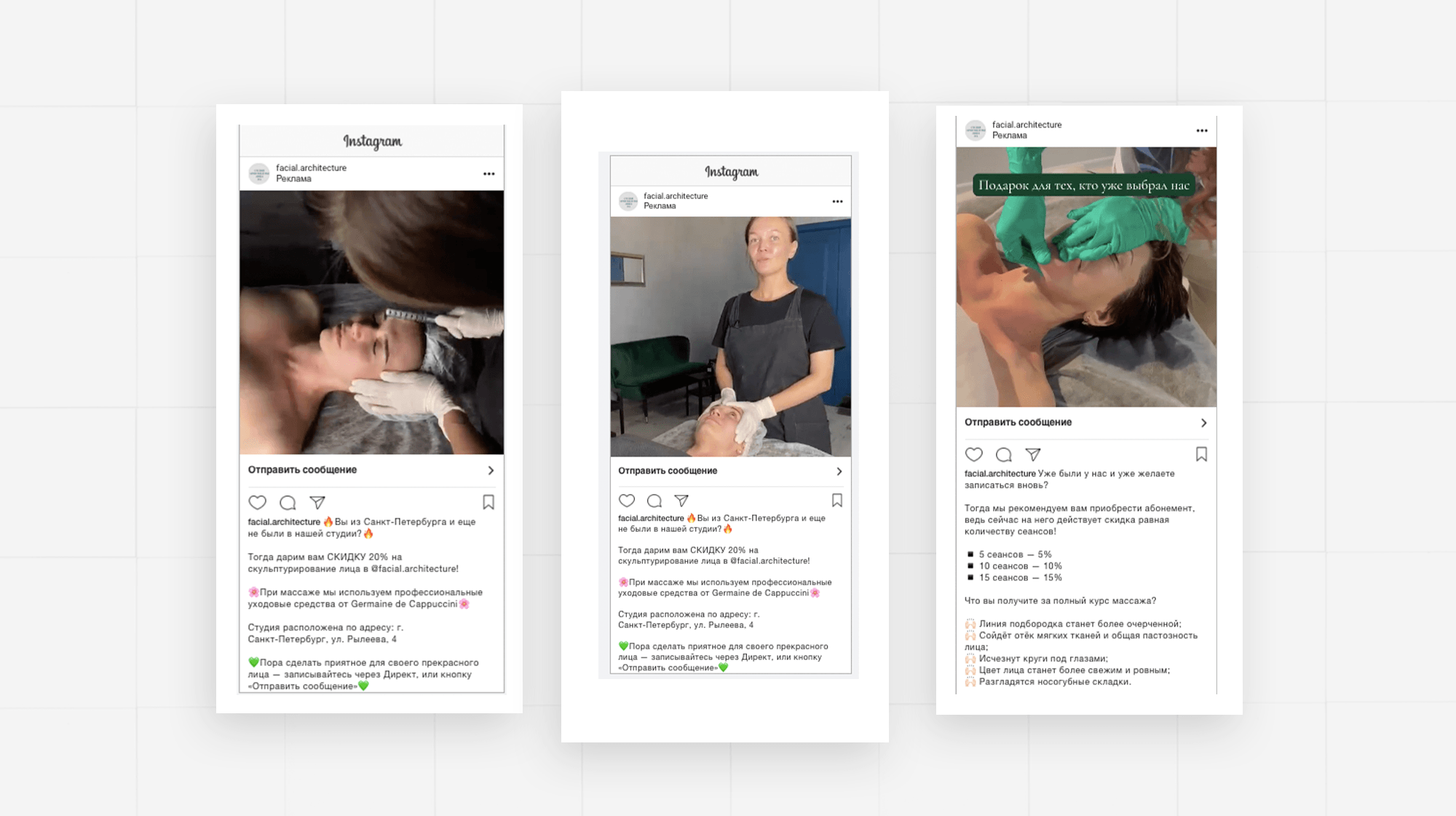 Примеры креативов на заявке в проекте «Архитектура лица». Слева направо: первые два — на холодную аудиторию категорий интересов, третий — на аудиторию взаимодействий