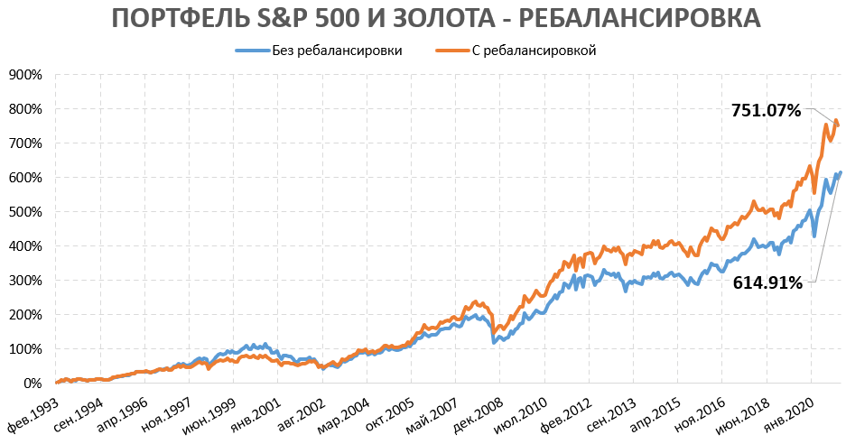 Для чего это делается? Во-первых, чтобы портфель не отклонялся от к первоначальной стратегии. Во-вторых, ребалансировка на длинной дистанции увеличивает доходность портфеля. По сути, мы продаём часть подорожавших активов и докупаем более дешёвые. Вот график для наглядности: