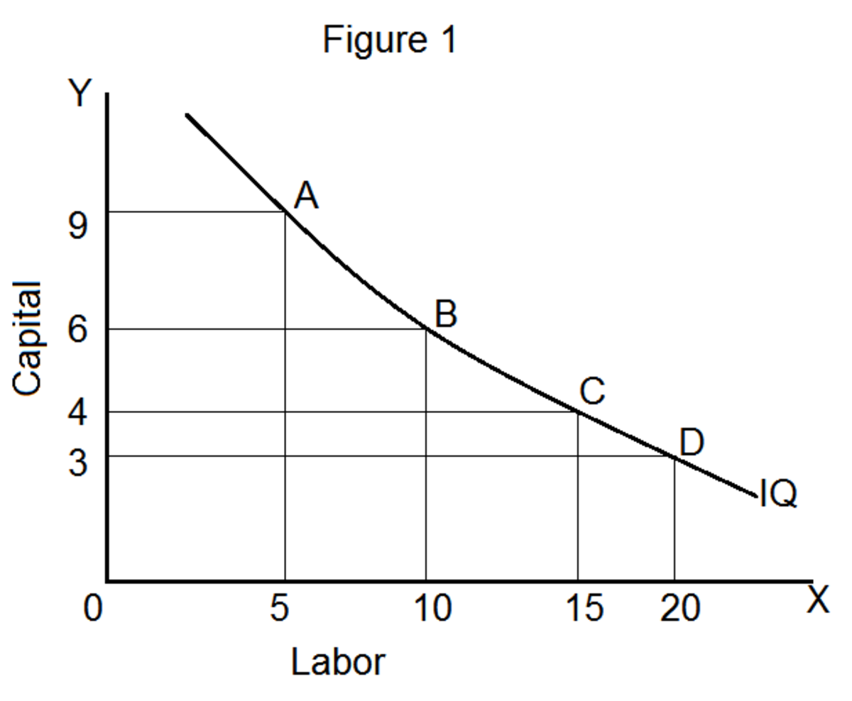 Из-за закона убывающей отдачи — экономической теории, которая предсказывает, что после достижения некоторого оптимального уровня производственной мощности добавление других факторов фактически приведет к меньшему увеличению выпуска — изоквантная кривая обычно имеет вогнутую форму. Точный наклон кривой изокванты на графике показывает скорость, с которой данные затраты, труд или капитал, могут быть заменены другими при сохранении того же уровня выпуска.