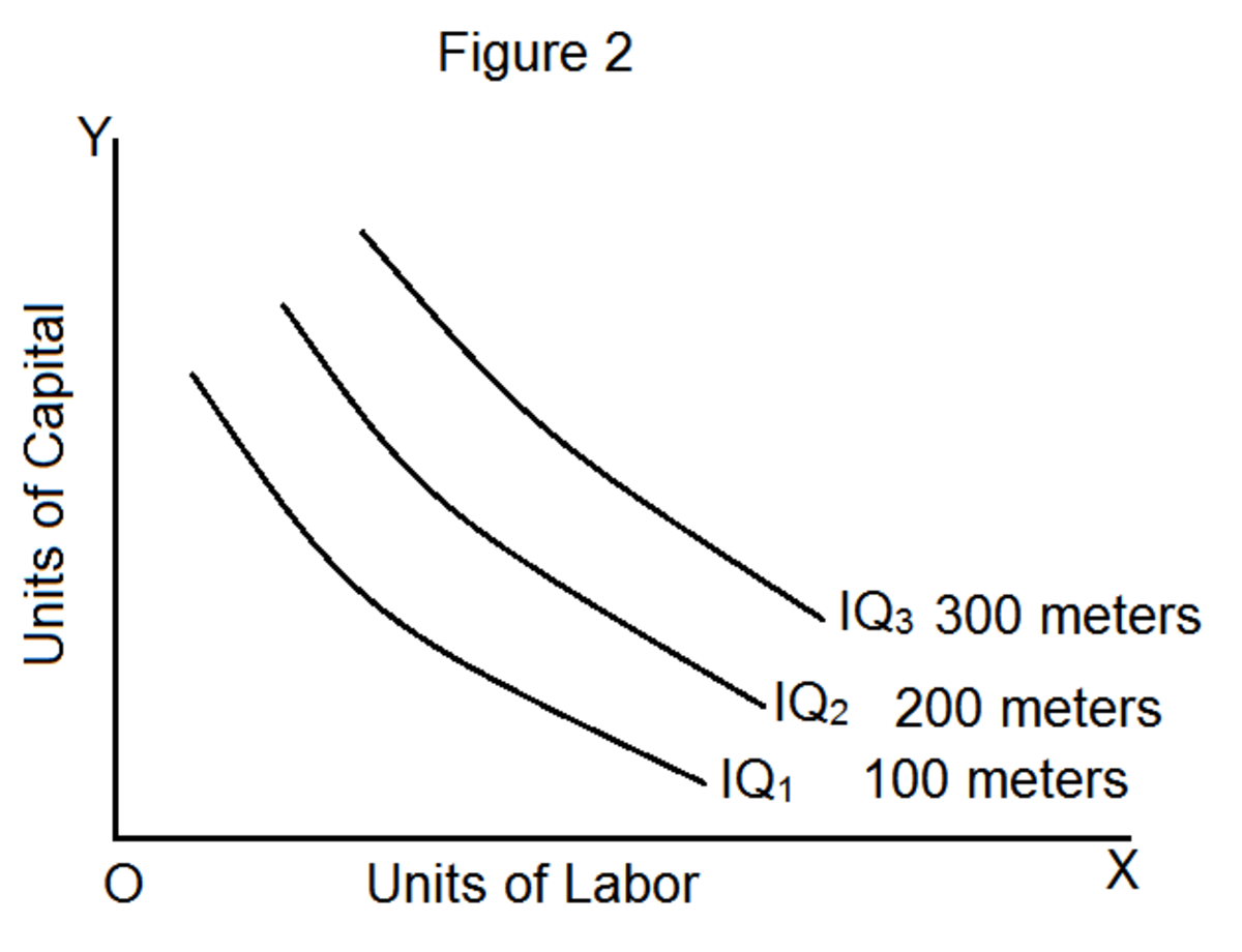 Изокванта более чем в одном смысле «аналогична» кривой безразличия. Свойства изоквант аналогичны свойствам кривых безразличия. Однако можно отметить и некоторые различия. Во-первых, в методе кривой безразличия полезность не может быть измерена. В случае изокванты продукт может быть точно измерен в физических единицах. Во-вторых, в случае кривых безразличия мы можем говорить только о более высоких или более низких уровнях полезности. В случае изоквант мы можем сказать, насколько IQ 2 на самом деле превышает IQ 1 (рисунок 2).