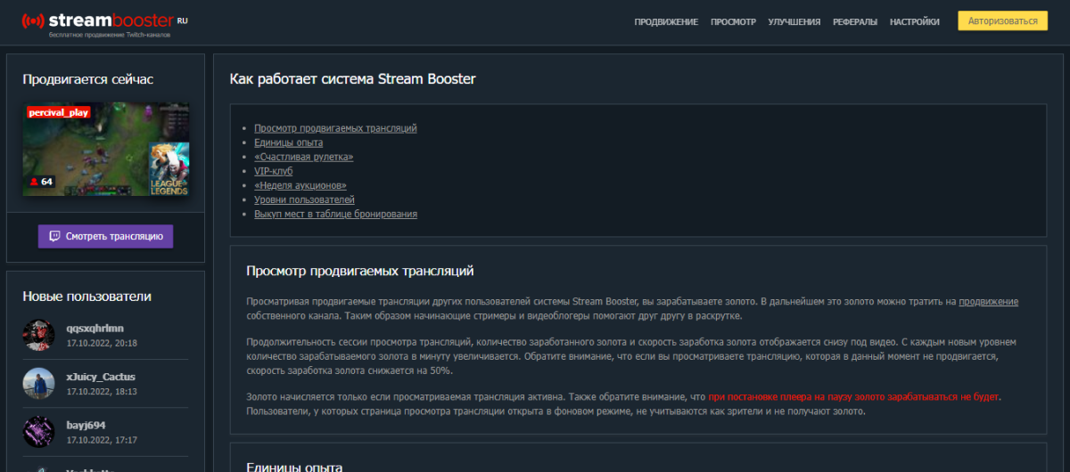 Stream Booster — это бесплатный сайт для продвижения стримеров на Twitch.tv. Принцип работы похож на предыдущий сервис, и заключается в том, чтобы транслировать свои стримы или получать за каждый просмотр очки, которые можно потратить на развитие своего аккаунта.