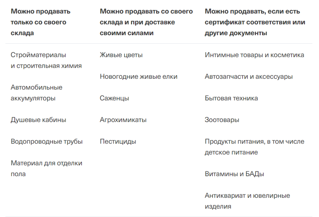 Учтите, что некоторыми товарами можно торговать только со своего склада или если доставляете своими силами. Для некоторых — понадобится сертификат соответствия.