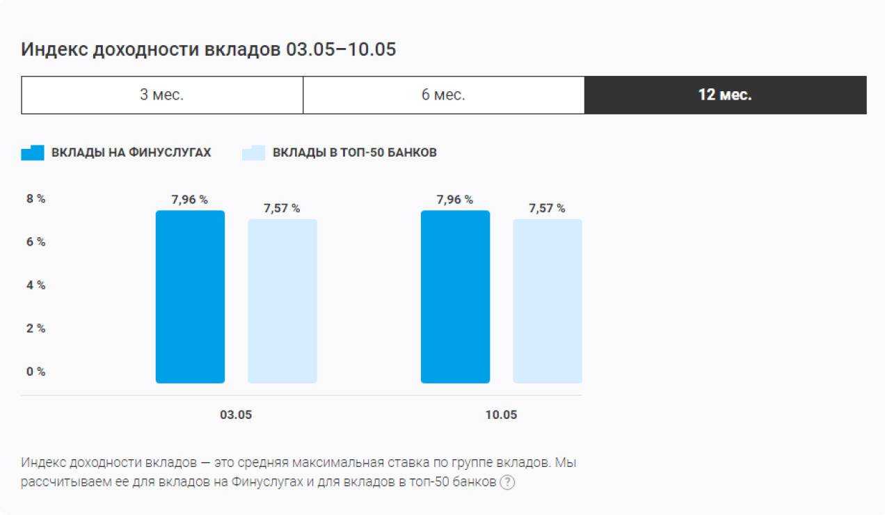 Средняя максимальная ставка по группе долгосрочных вкладов на Финуслугах составляет 7,9%.