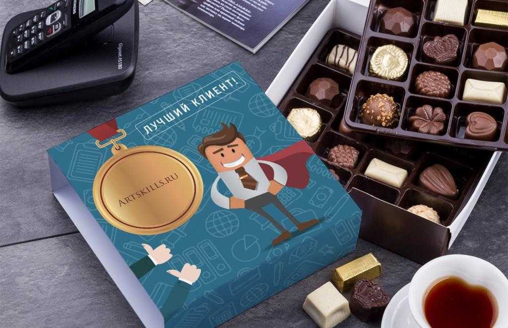 Вы также можете презентовать что-то из лакомств, еды. Например, коробку конфет в коробке с забавным дизайном. Например, с надписью: «Самому лучшему клиенту», «Самому лучшему сотруднику» и т. д. Можете подарить и шоколадные медали.