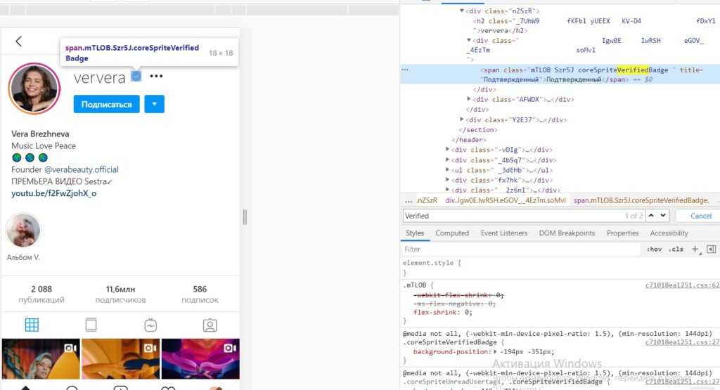Копируем код. Он должен выглядеть примерно так: <span class=»mTLOB Szr5J coreSpriteVerifiedBadge » title=»Подтвержденный»>Подтвержденный</span> Заходим на свою страницу, снова в инструменты разработки. Выбираем «Редактировать HTML» и вставляем код в соответствующий элемент (можно подсмотреть на странице-доноре).