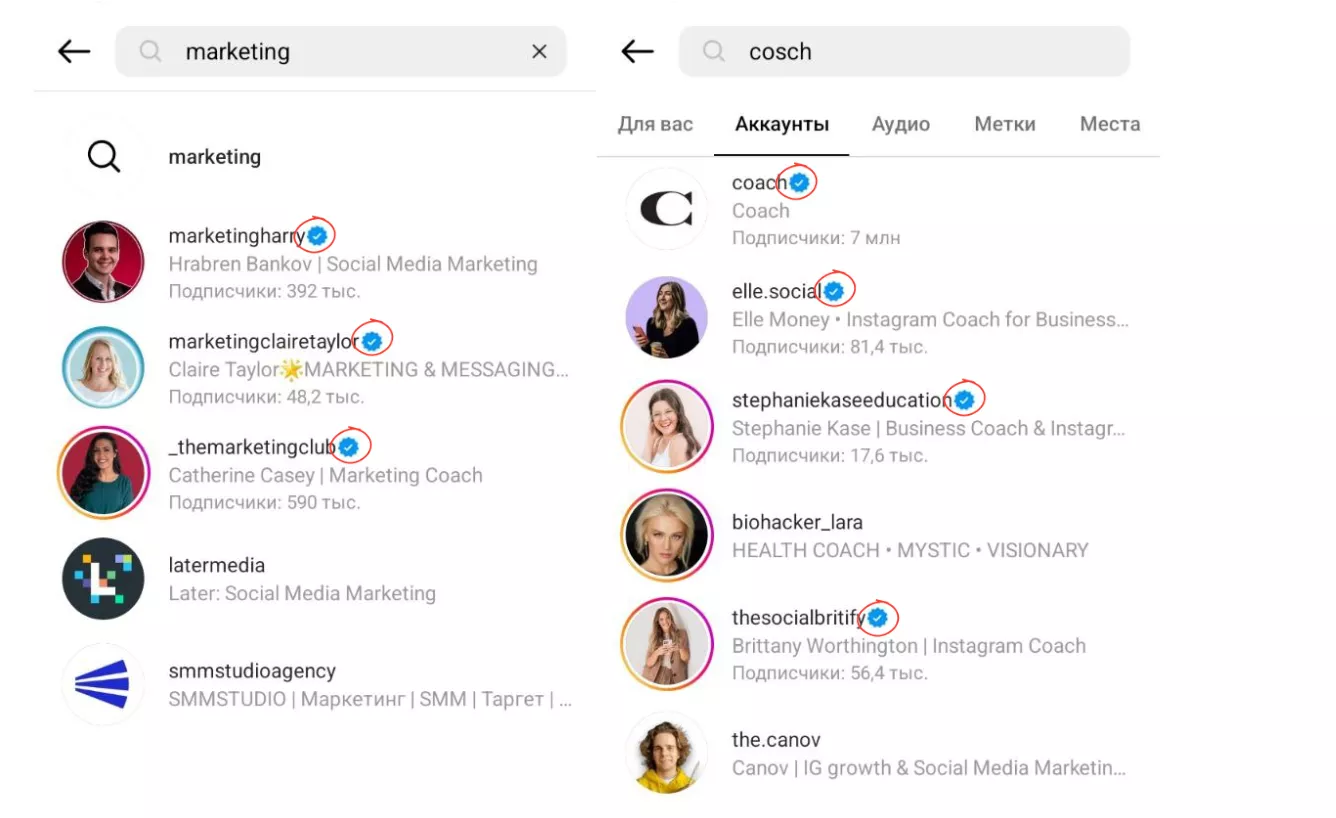 - Это поможет вам выделиться в результатах поиска — верифицированные аккаунты появляются в верхней части результатов поиска Инстаграм.