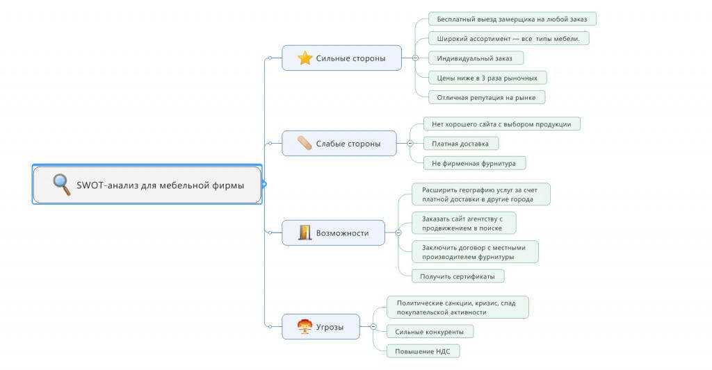 В анализе поможет метод SWOT. Заполните таблицу — сильные / слабые стороны, возможности / угрозы. Используйте пятибалльную систему оценки.
