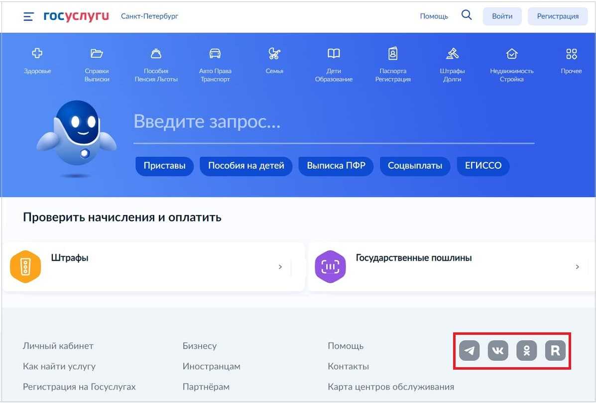Рис. 8. Главная страница Госуслуг, внизу есть кнопки соцсетей.