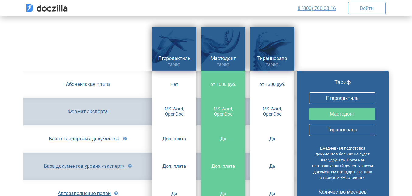 - «тираннозавр» — безграничный доступ ко всей базе документов Doczilla. Подойдет для компаний, которым часто приходится заниматься документами разных уровней сложности.