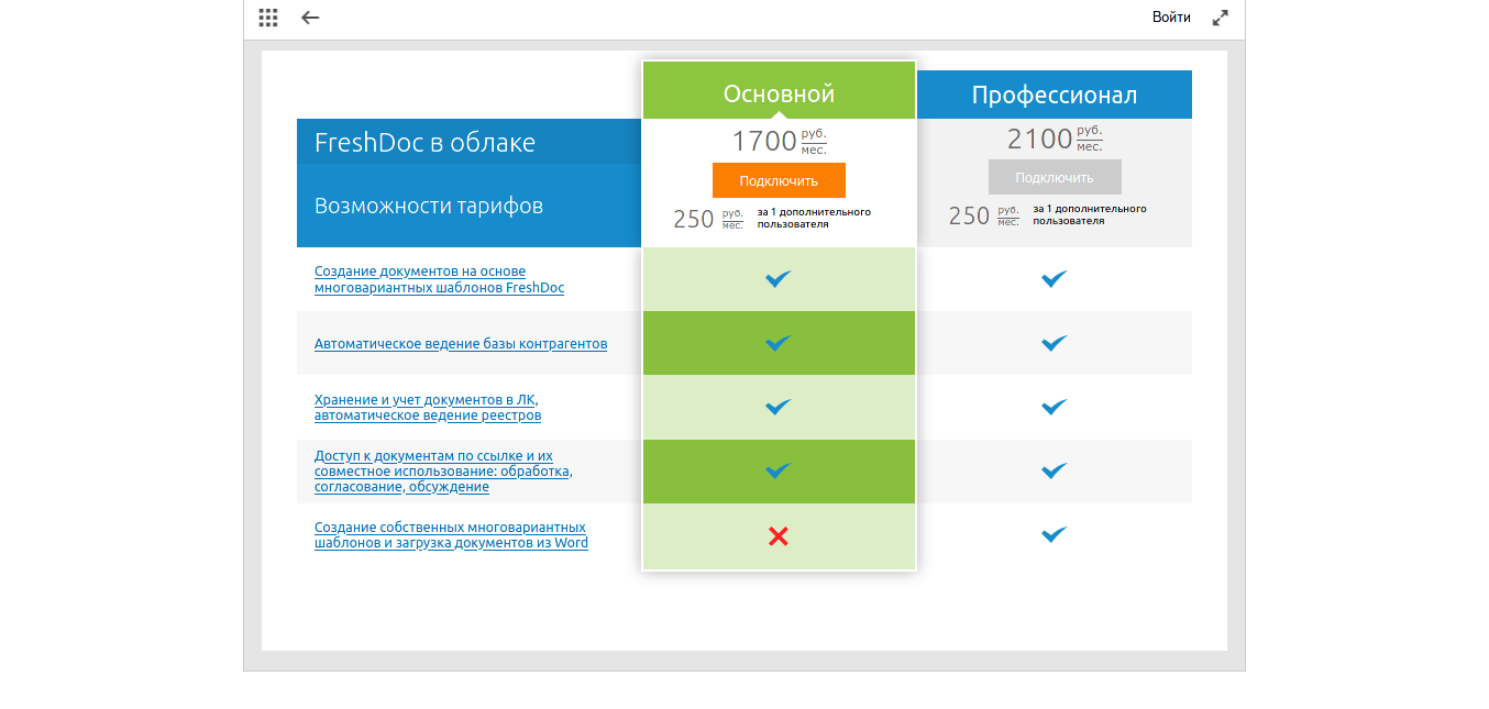 - «мастодонт» — подойдет для регулярного ежедневного использования. За экспертные документы здесь также придется доплатить, а количество копий документов по шаблону уже не ограничено. Более того, в данном тарифе включен модуль совместной работы над документами;