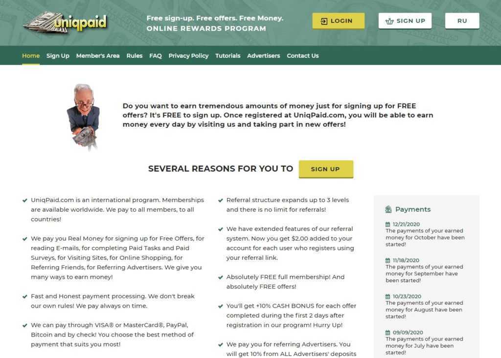 Uniqpaid – американский кликовый спонсор, поддерживающий русский язык. Оформление не самое привлекательное, но для стабильной работы он подойдет. Минимум к выводу 1$, реально собрать буквально за 2 часа. Есть трёхуровневая партнёрка, с которой удается создать пассивный источник прибыли.