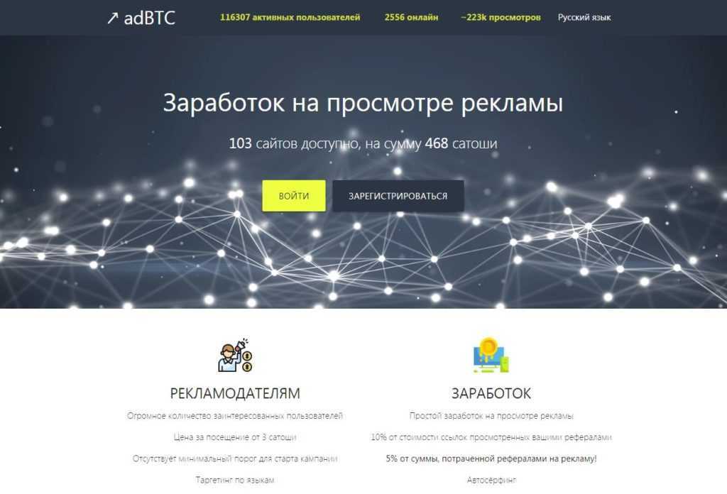 AdBTC — сайт иностранный, но русский язык здесь поддерживается. Заданий нет, зато есть три режима сёрфинга. Особенность его в том, что платят за клики в Биткоинах. Приглашайте сюда рекламодателей и получайте 5% от расходов, либо 10% с дохода исполнителей.