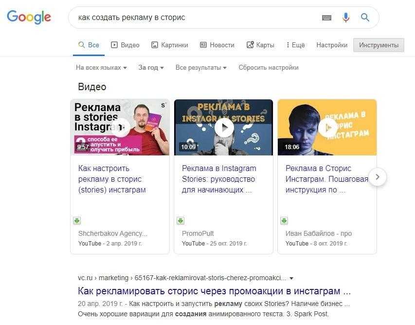 Помимо развлечения, пользователи ждут от видео ответы на свои вопросы. Так, если вы введете в поиск Google вопрос, то в большинстве случае первой строкой будет подборка видеороликов на интересующую вас тематику.