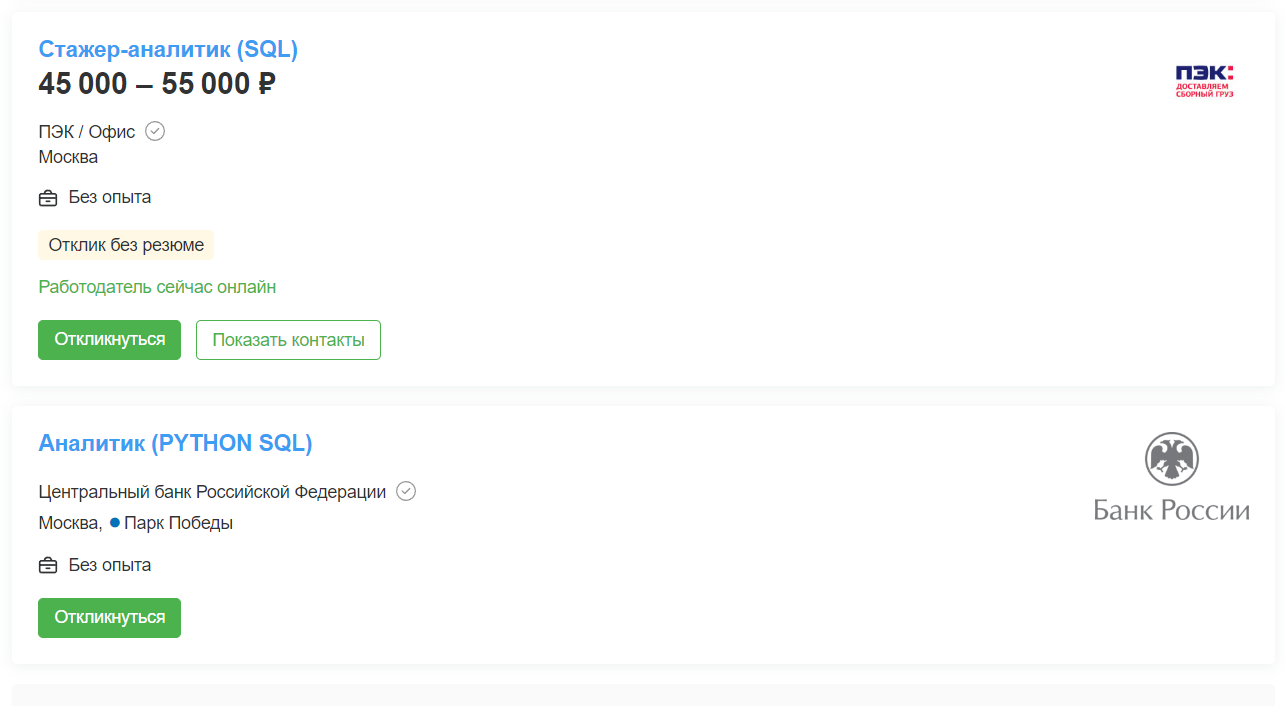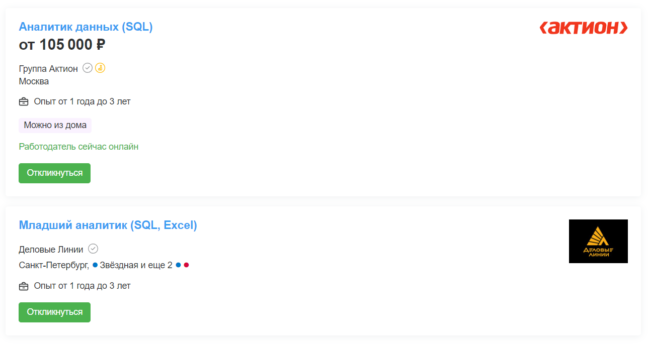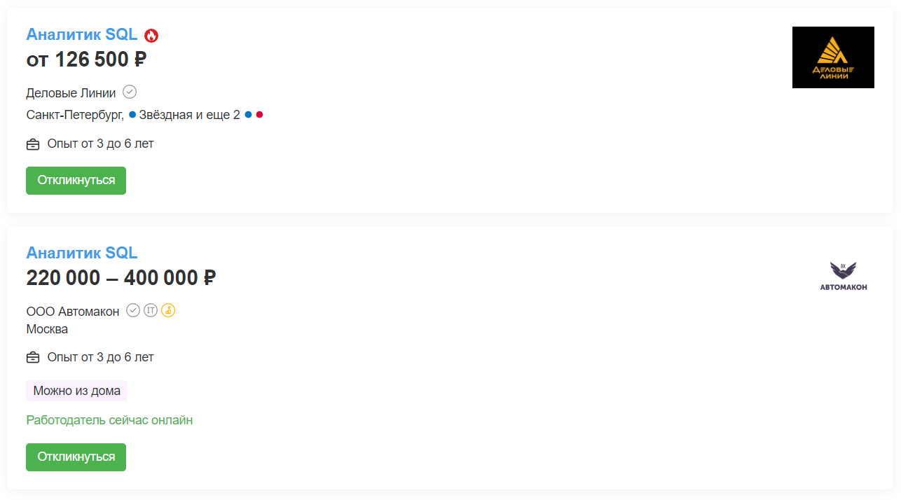 В августе 2023 года на сайте hh.ru работодатели разместили почти 8000 вакансий для SQL-аналитиков. Специалистов ищут не только в Москве и Санкт-Петербурге, но и почти во всех крупных городах России. Они нужны и небольшим фирмам, и огромным корпорациям, таким как «Сбер», Askona, «Деловые Линии», «Билайн», «Контур», МТС, банк «Точка».