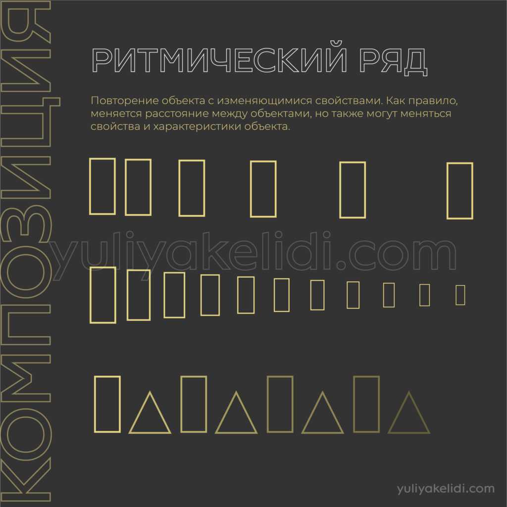 Ритмический ряд — это повторение объекта с изменяющимися свойствами. Как правило, меняется расстояние между объектами, но также могут меняться свойства и характеристики объекта. Ритмический ряд изменчив, динамичен, нестабилен.