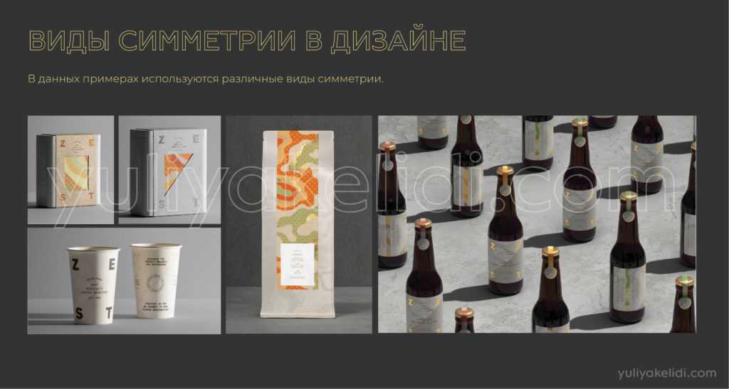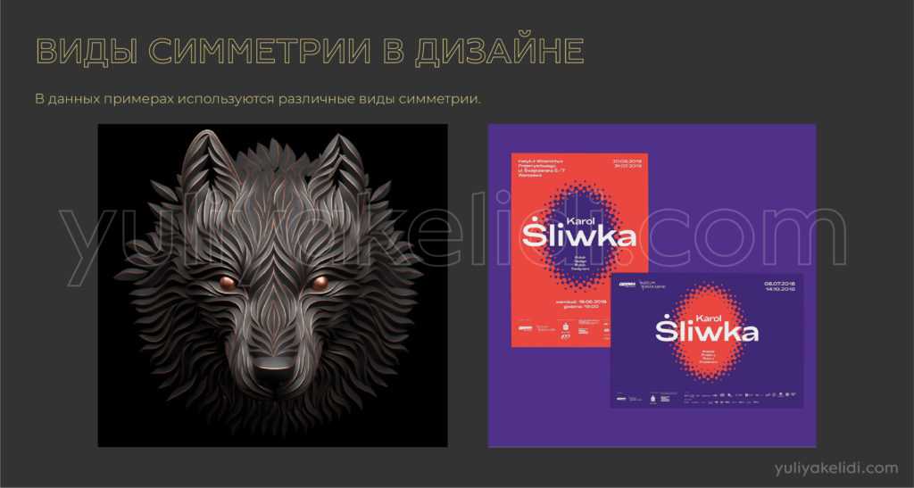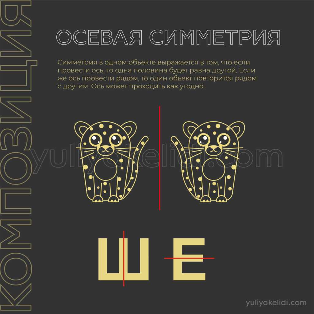 Самая первая, которая приходит на ум многим — это зеркальная или осевая симметрия. Симметрия в одном объекте выражается в том, что если провести ось, то одна половина будет равна другой. Если же ось провести рядом, то один объект повторится рядом с другим. Ось может проходить как угодно. Но в дизайне симметрию можно рассмотреть более абстрактно, если мы объекты объединим в формы, то эти формы будут располагаться симметрично, тем самым создавая полное равновесие.