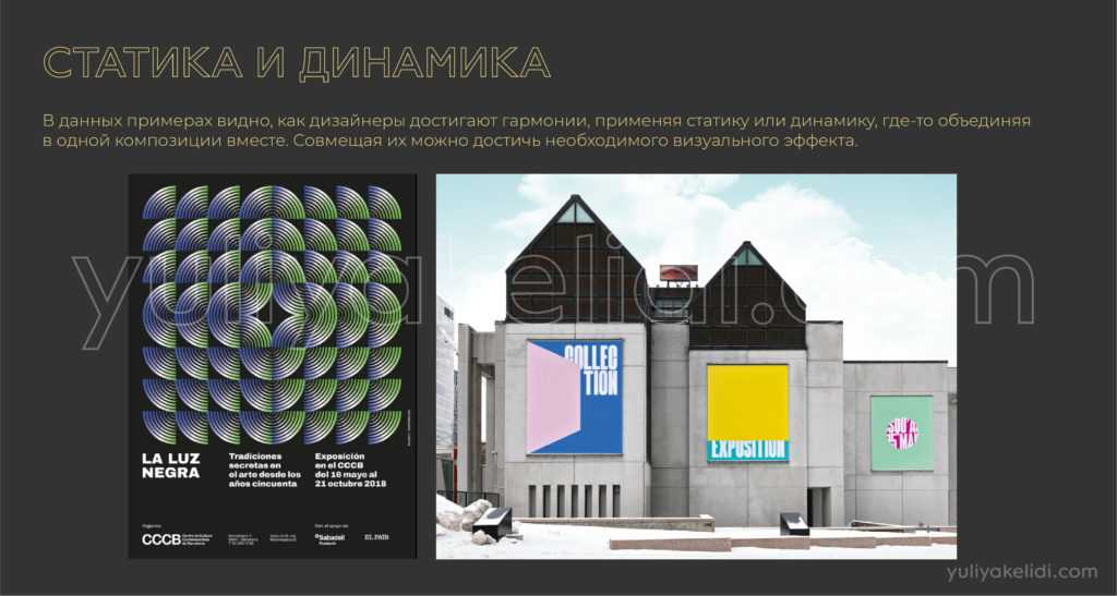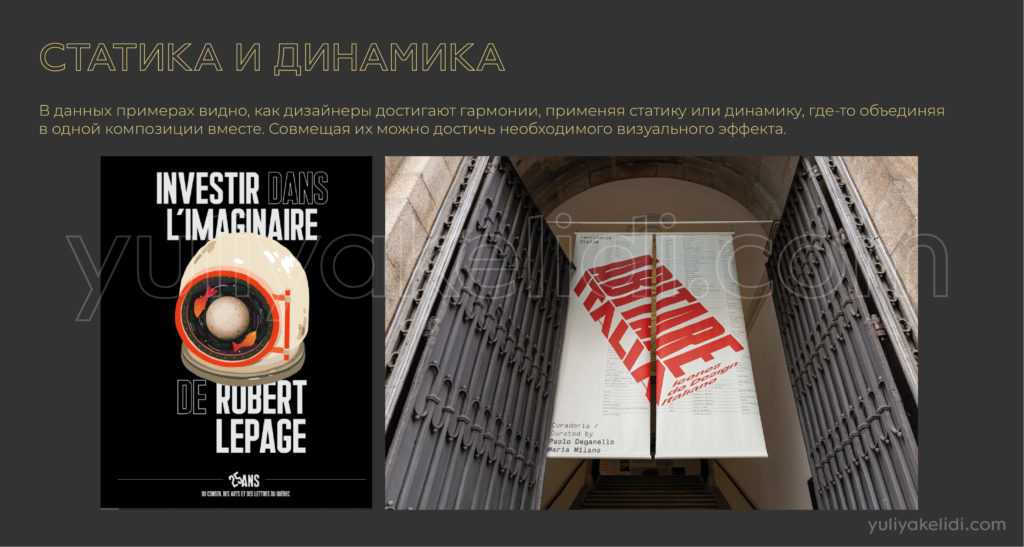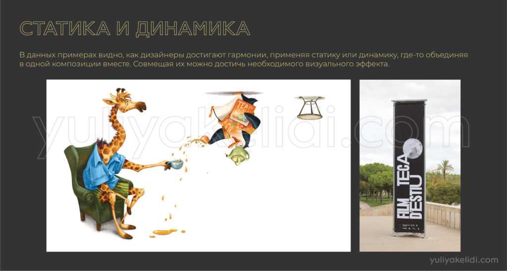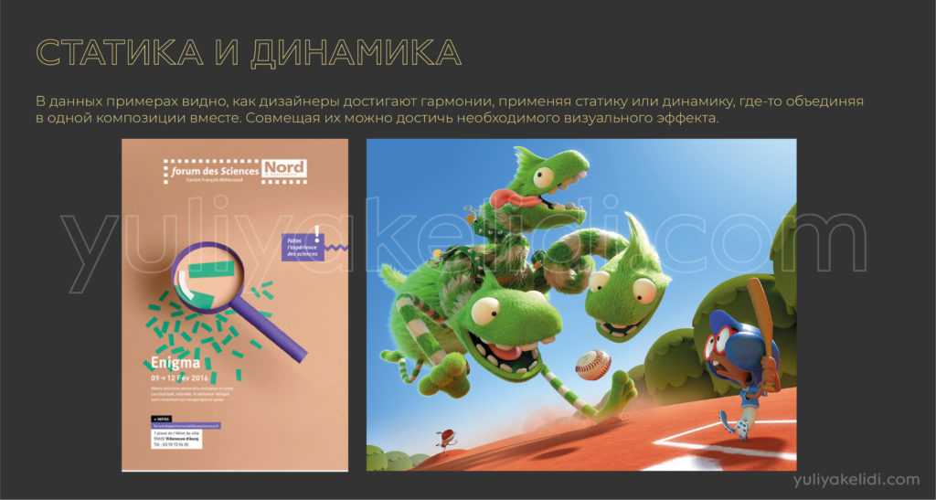 Динамика часто сопровождает темы, где нужно продемонстрировать движение, извилистость, действие, стремление. Часто присутствует там, где есть какой-то визуальный акцент, который не совпадает с геометричным центром.