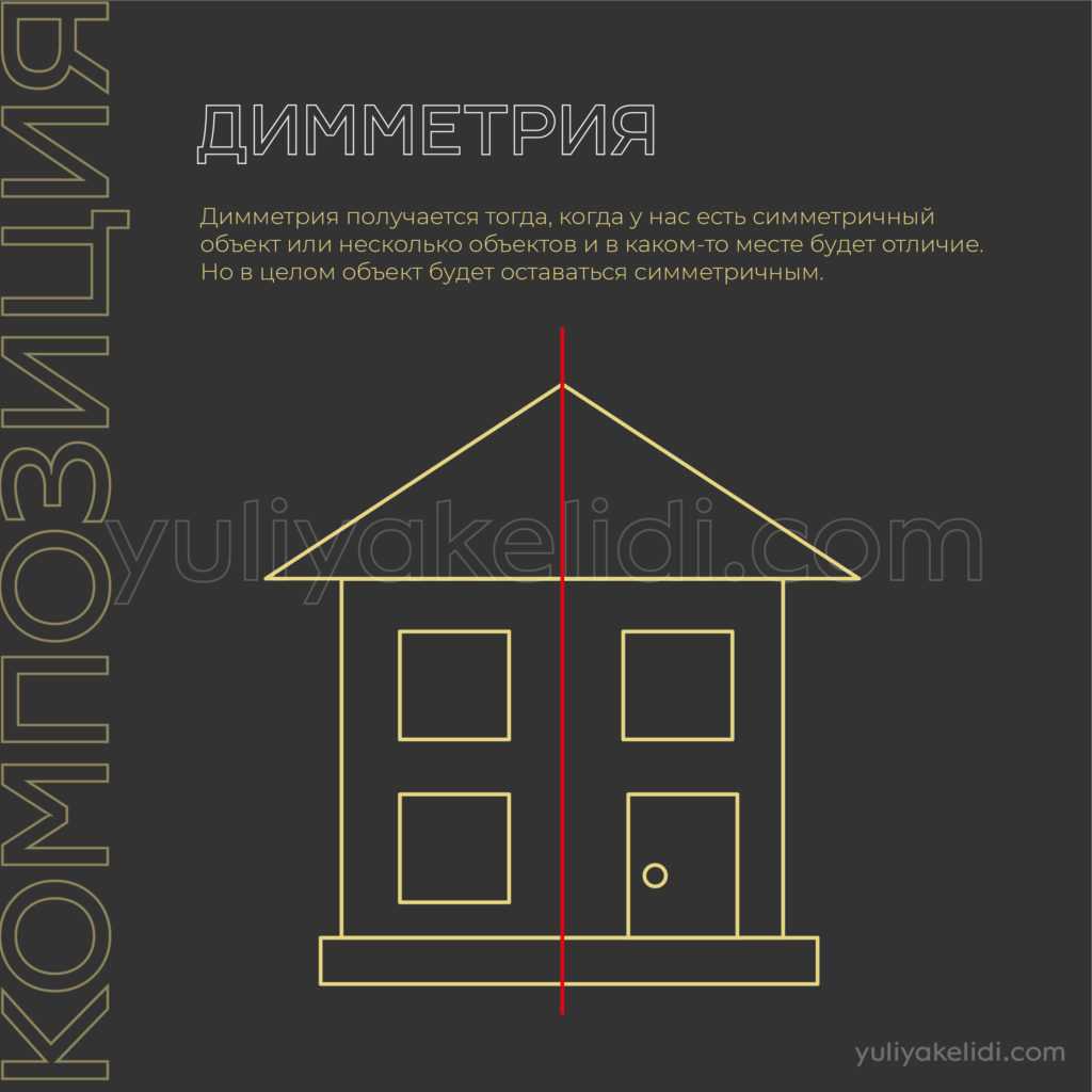 Димметрия получается тогда, когда у нас есть симметричный объект или несколько объектов и в каком-то месте будет отличие. Но в целом объект будет оставаться симметричным.