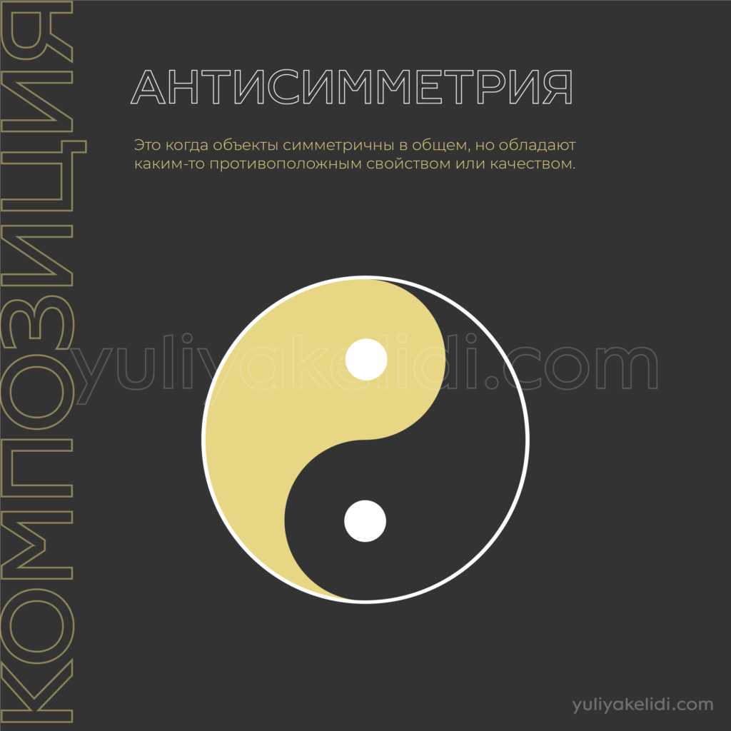 Антисимметрия — это когда объекты симметричны в общем, но обладают каким-то противоположным свойством или качеством.