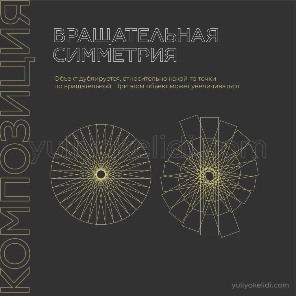 Вращательная симметрия. Хорошим примером такой симметрии служит винтовая лестница. Т.е. объект дублируется, относительно какой-то точки по вращательной. При этом объект может увеличиваться.