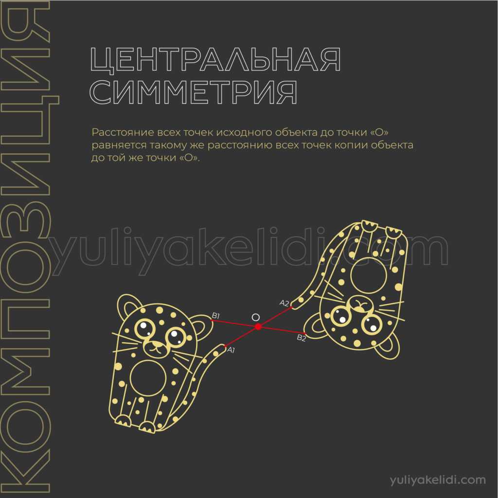 Центральная симметрия — это когда мы, рядом с объектом ставим точку «О» и относительно неё перемещаем копию объекта. Расстояние всех точек исходного объекта до точки «О» равняется такому же расстоянию всех точек копии объекта до той же точки «О».