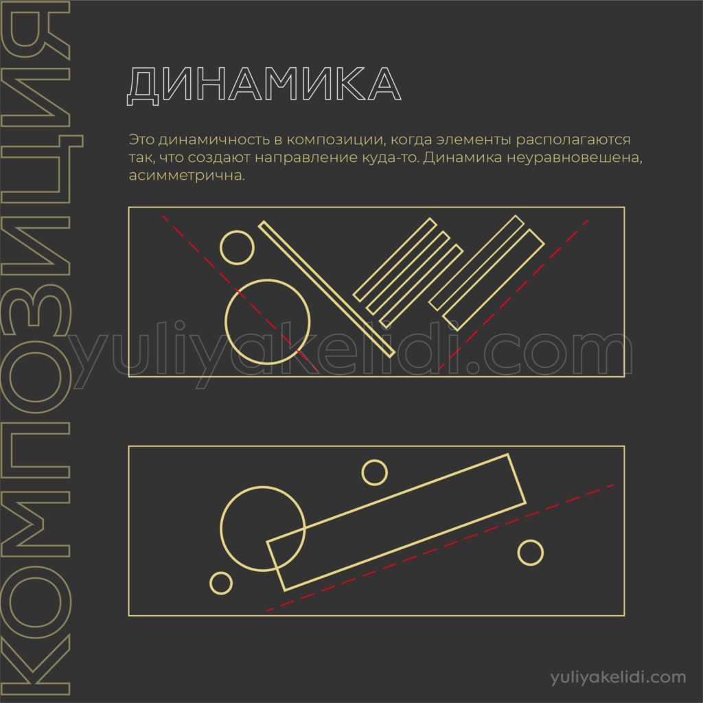 Динамика — это динамичность в композиции, когда элементы располагаются так, что создают направление куда-то. Динамика неуравновешена, асимметрична.