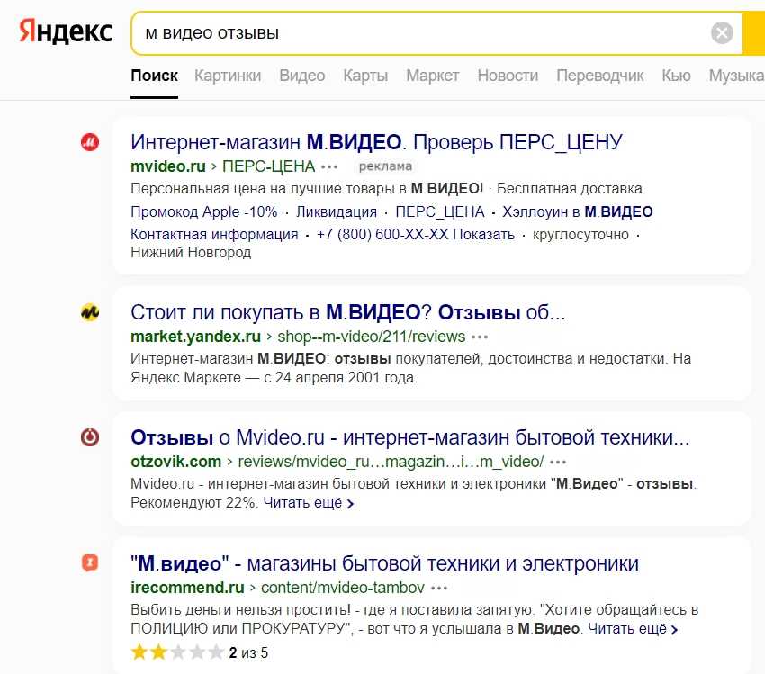 В топе органики по запросу «бренд отзывы» чаще всего находятся крупные авторитетные отзовики: IRecommend, Yell, Otzovik, Flamp, Tripadvisor и другие. Компания не может контролировать отзывы на этих ресурсах. Сместить их вниз может рекламное объявление с сайтом компании. Чем больше мест в топе получится занять, тем меньше шанс, что пользователь дойдет до сторонних отзовиков.